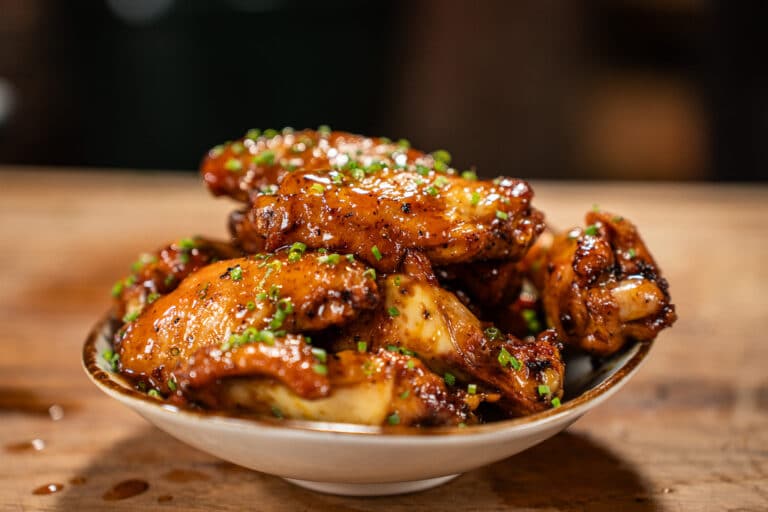 Voor het Chicken wings van het spit recept heb je het volgende nodig: 1 kg Kippenvleugels, Feather Duster rub, 5 el Double Trouble Carolina, 5 el Honing en een handje Bieslook.