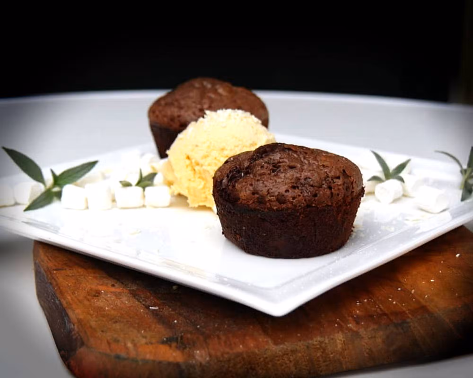 Het lekkerste is om de moelleux warm op te dienen. De chocolade in het midden is dan nog mooi zacht. Haal ze uit de muffinvorm door ze er van onderuit uit te drukken. Vanille ijs, frambozen, mini marshmallows en het groen van bijvoorbeeld een blaadje munt zorgen voor de rest van de opmaak van je bord. Als je twee van deze chocolade gebakjes op één bord serveer, dan kun je er samen nog meer van genieten!