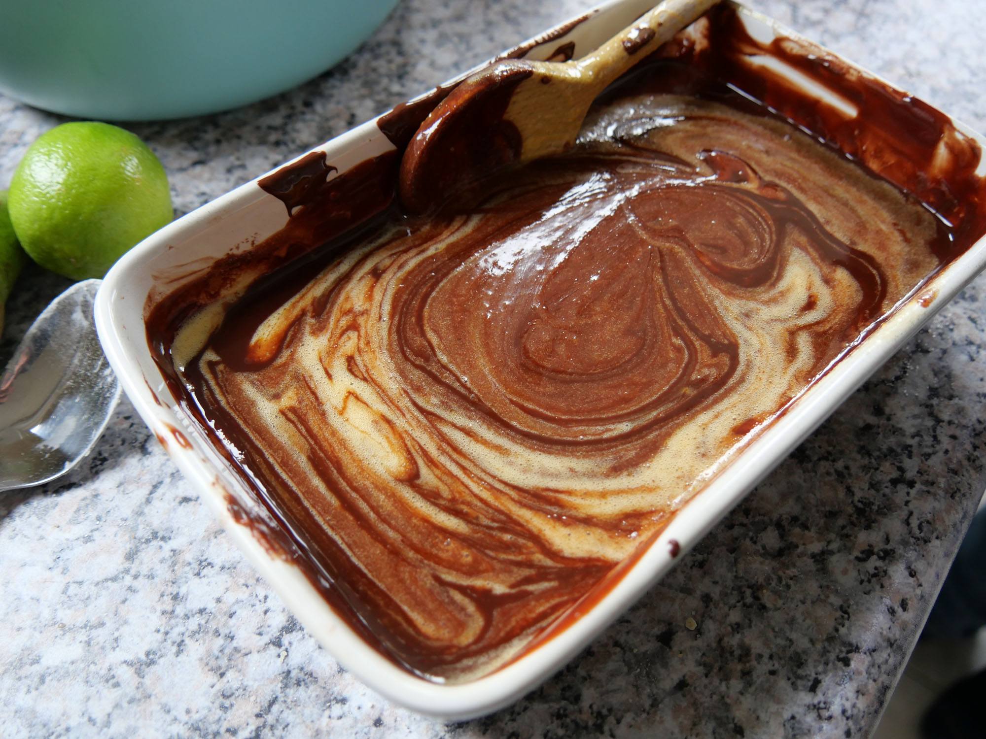 Doe ondertussen de chocolade en boter in een ovenschaal. Als de houtskool voldoende gloeit plaatsen we een hitteschild (platesetter) met RVS rooster. Zet de ovenschaal direct op het rooster, sluit het deksel met de schuiven onder en boven nog volledig open. Terwijl de kamado langzaam opwarmt naar de 200 graden Celsius, gebruiken we de warmte in het begin om de chocolade te laten smelten. Als de chocolade enigszins is gesmolten dan halen we de schaal eruit en roeren de chocolade met de boter.