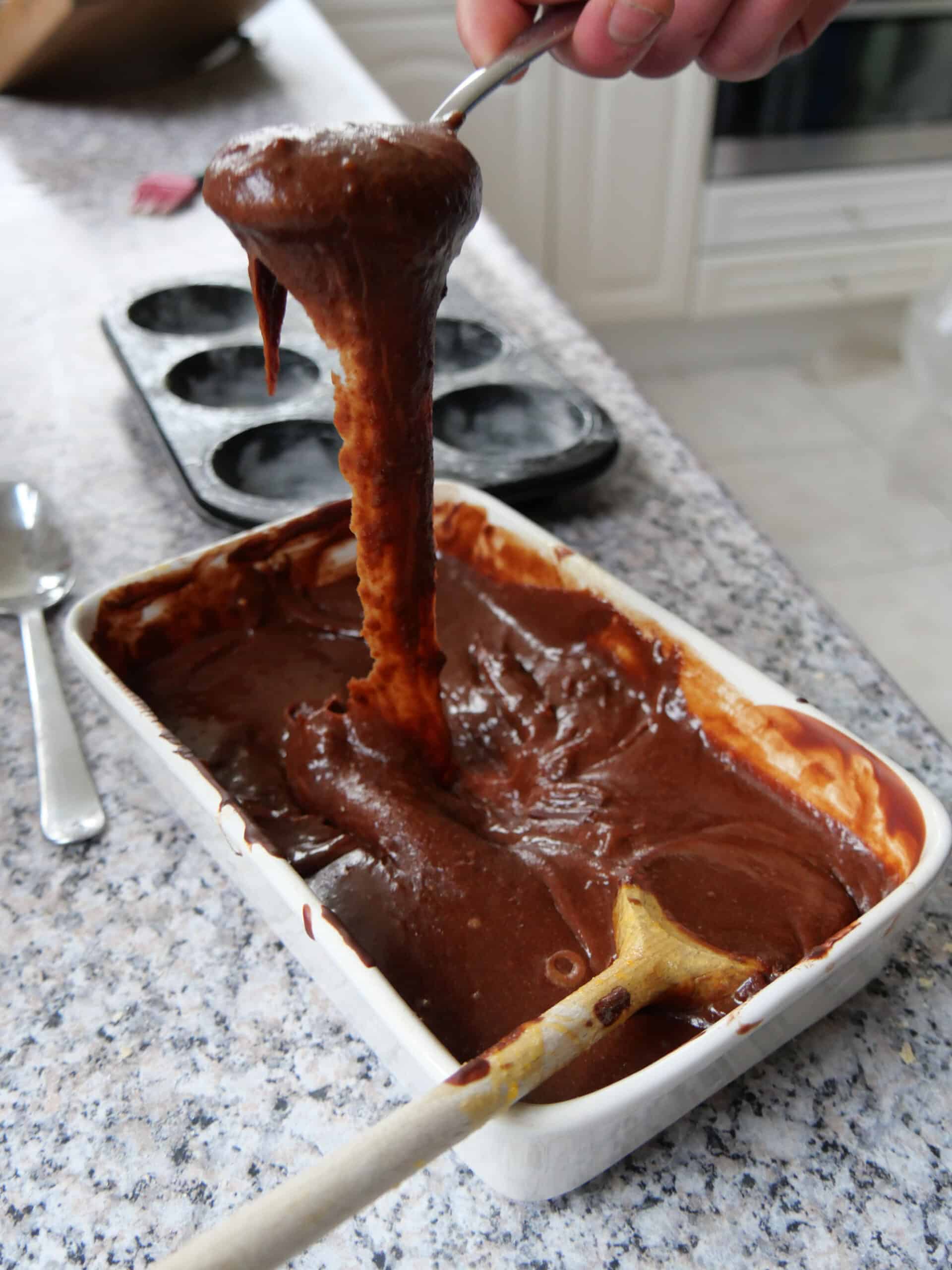 Terwijl het chocoladebeslag afkoelt in de koelkast en de kamado tot een stabiele 200 graden komt, gaan we de muffinvorm lichtjes invetten en voorzien van wat bloem.