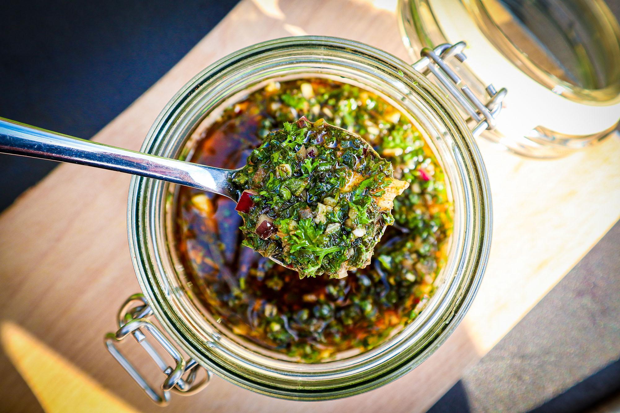 Snipper de ui en knoflook zo klein mogelijk. Doe de kruiden in een weckpot, voeg de ui en knoflook toe, en maak af met de olijfolie, gerookte paprikapoeder en peper en zout naar smaak. Geef de chimichurri minimaal 4 uur om op smaak te komen. Wij vinden de chimichurri het lekkerste met onderstaande structuur.