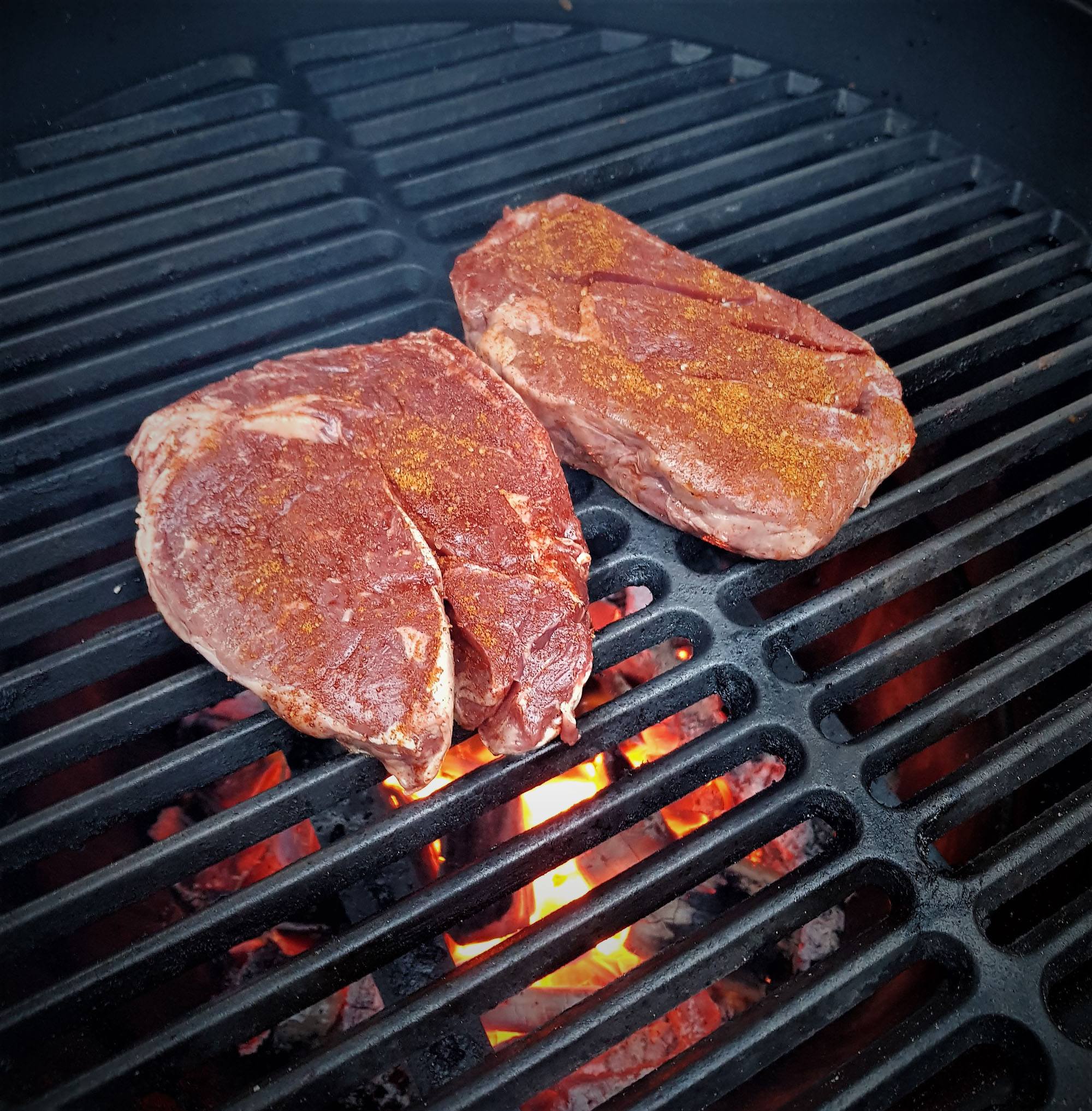 Haal de steak uit de verpakking en dep even droog met keukenpapier. Rub de steaks aan beide kanten met de braairub nr3. Dit mag je doen net voor de steaks op de BBQ gaan.