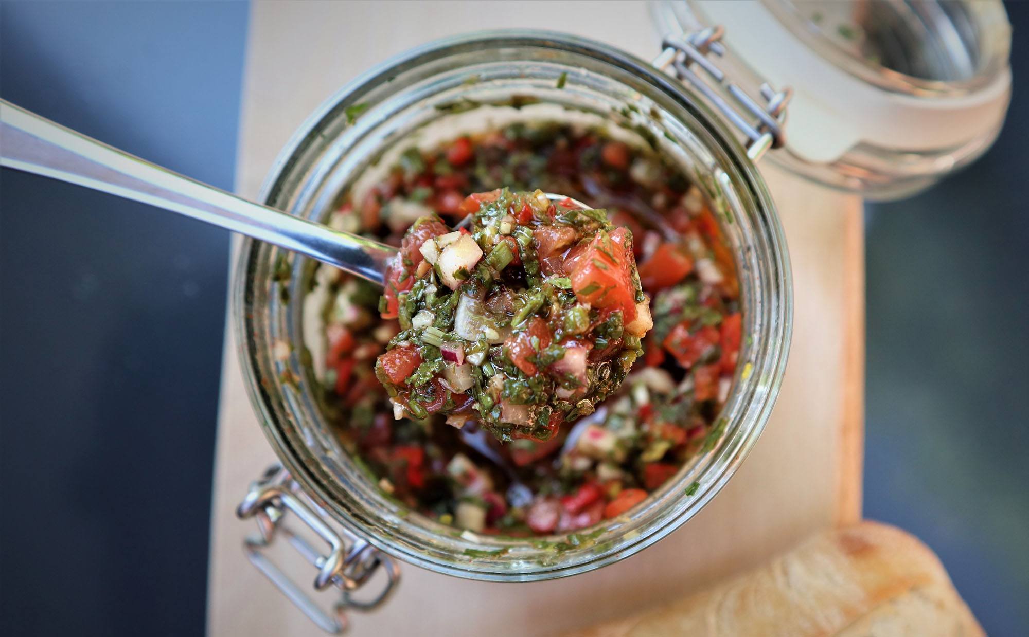 Snipper de ui en knoflook fijn, en snijd de tomaat in blokjes. Ontdoe de chili van de pitjes (als je van pittig houdt, hak er dan een paar fijn, gooi anders de pitjes weg) snijd de chili in kleine stukjes. Doe alle ingrediënten in een weckpot en schenk er een flinke scheut olijfolie op. Roer alles goed door elkaar en breng op smaak met peper en zout.