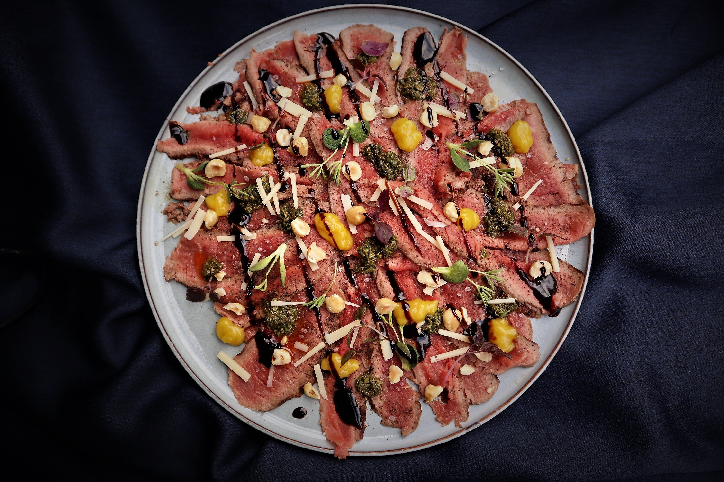 Werk het bord van uit het midden naar buiten en leg alle plakjes overlappend over elkaar tot het hele bord bedekt is. Garneer het geheel met alle ingrediënten die je klaar hebt staan, iedere opmaak is geoorloofd?