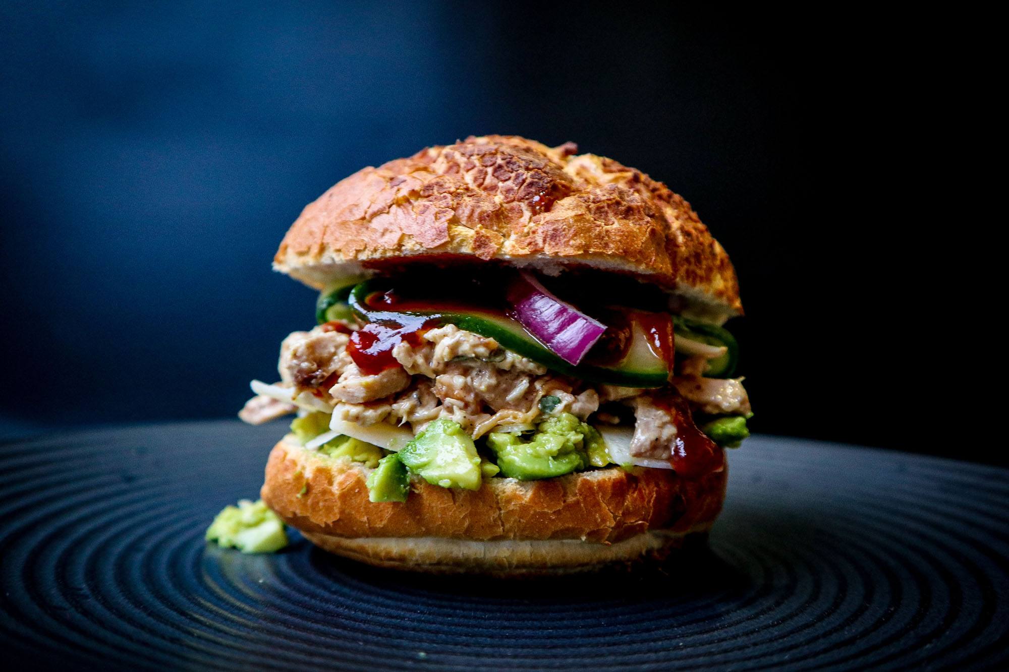 Gegrilde kipsandwich, met smashed avocado en komkommer in zuur