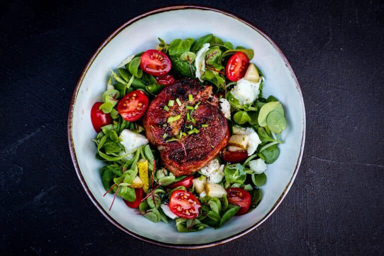 Maak je salade op, neem een stuk vlees, ontdoe dit van het touwtje en leg het vlees op de salade. Maak get geheel af met de bieslook en de sherry dressing.