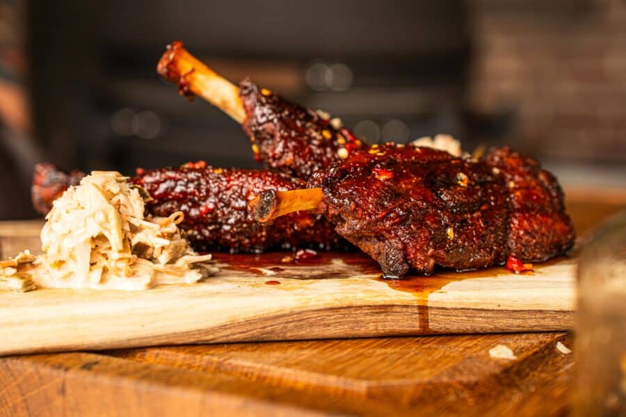 Doe je pork steaks in een bak of schaal. Maak een marinade van 200 ml bourbon, 4 eetlepels honing en een flinke hand Angus & Oink – Honey Chili rub. Giet over de pork steaks en dek af. Laat de steaks marineren voor ongeveer 2 uurtjes. Snij de uien in ringen van ongeveer 2-3 cm dik en bestrooi met wat van de rub.