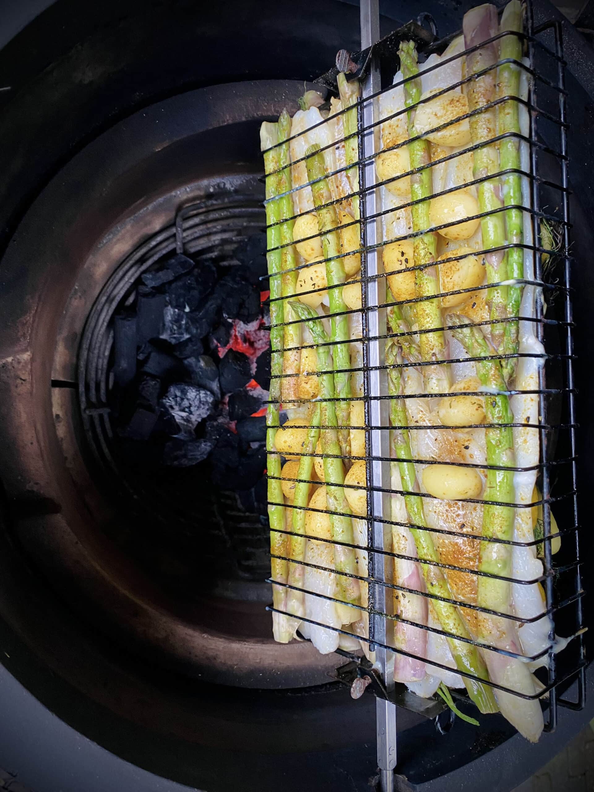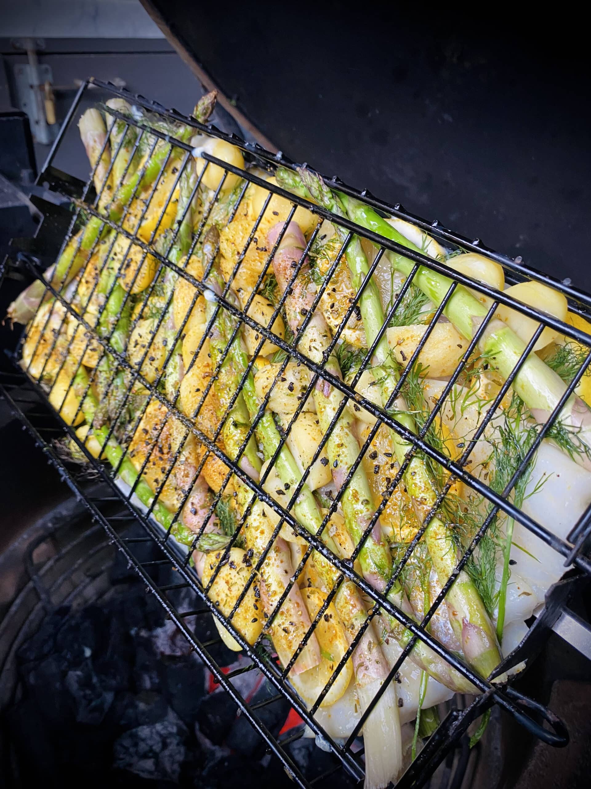 Dit is een hoofdgerecht waarbij we kabeljauw filets of scholfilet met groene asperges, voorgekookte krieltjes en citroen klaarmaken op een flat rack in een rotisserie op de barbeque. Het wordt verder op smaak gebracht met verse dille, olijfolie en Braairub #1 of Angus & Oink Seafood Lemon Pepper.