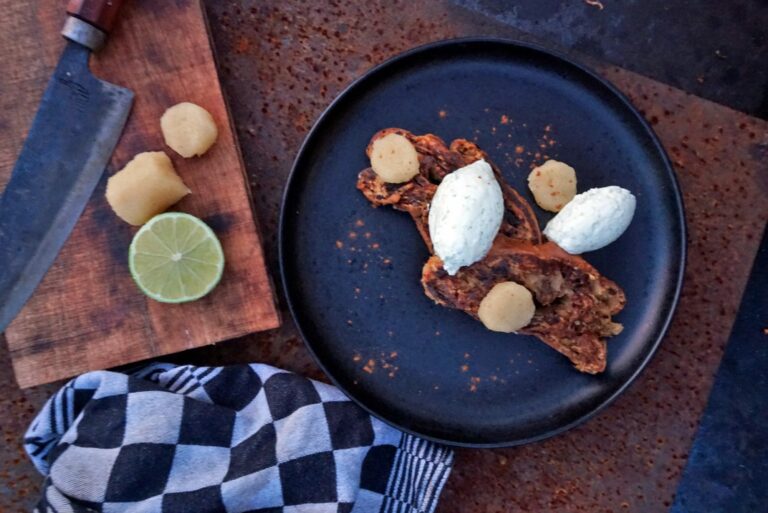 Voor dit recept is mijn keuze gevallen op de pellet barbecue. Ik heb hier een plancha plaat opgelegd en de pellet ingesteld op 225 graden. Dit recept zou je ook kunnen maken op een vuurring wanneer je zorgt voor een sterke vlam onder de ring.