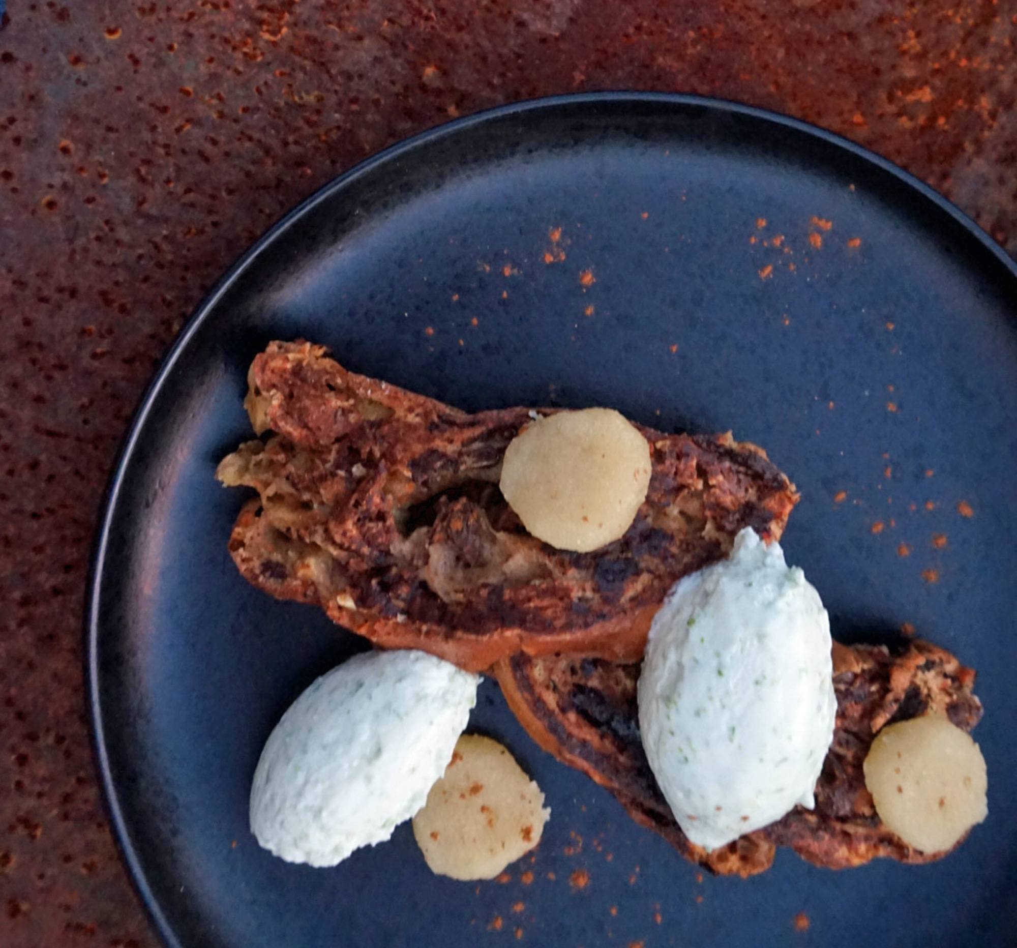 Leg de wentelteefjes op het bord. Je kunt deze eventueel met het amandelspijs besmeren of er plakjes van maken zoals op de foto. Leg boven een quenelle limoen-mascarpone en serveer. Lekker met een bol vanille of kaneel ijs erbij!