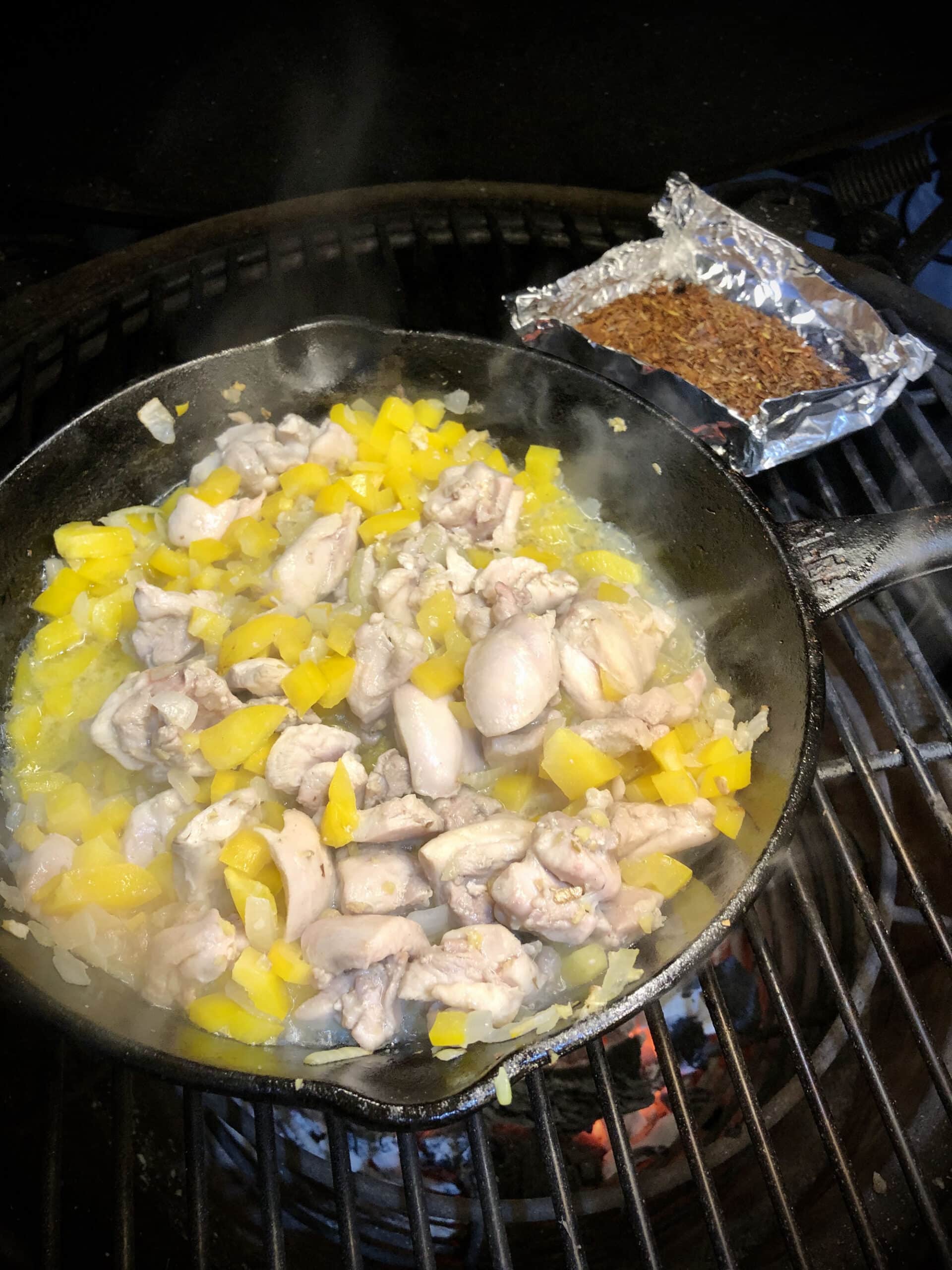 Doe een scheut olie in de pan en bak de ui, gember en knoflook zachtjes aan tot de ui glanst en lichtbruin begint te kleuren. Daarna gaan de blokjes kippendij er bij. Laat het vuur iets oplaaien door de barbecue open te laten staan. Bak de kip goudbruin en voeg dan de paprika en de sugarsnaps toe.