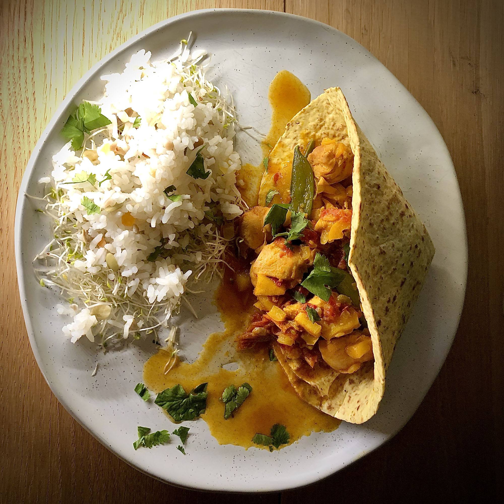 Tussen de handelingen door kook je de rijst en als laatste kun je tortilla’s grillen op de barbecue tot tostada’s. De Curry madras geef je extra smaak en decoratie met fijn gehakte verse koriander en wat kiemgroente.