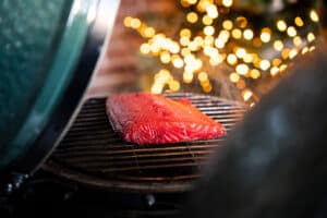 Zodra de rookmot begint te smeulen blaas je het kaarsje uit en verwijder je deze uit de cold smoke generator. Vervolgens plaats je de cold smoke generator met de smeulende mot onder in de kamado. Plaats vervolgens het hitteschild en het RVS-rooster en leg de zalm op het rooster. Laat de zalm ca. 10 uur koud roken. Haal na 10 uur de zalm uit de kamado. Pak deze vervolgens in met folie en laat nog 24 uur rusten. Hierdoor zal de rooksmaak nog beter in de vis trekken