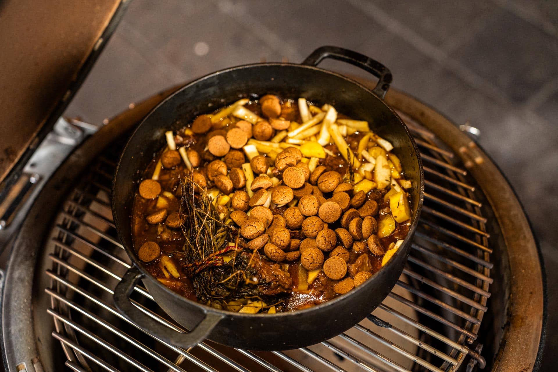 Blus het geheel af met het bockbier en voeg de runderbouillon en het bosje kruiden (Peterselie, rozemarijn en laurier, tijm) toe. Doe de deksel op de Dutch Oven en sluit de barbecue. Roer regelmatig. Controleer geregeld of het vlees rustig aan het stoven is. Keihard koken is niet goed. Gaat het te hard? Plaats dan een hitteschild zodat het stooft in plaats van kookt.