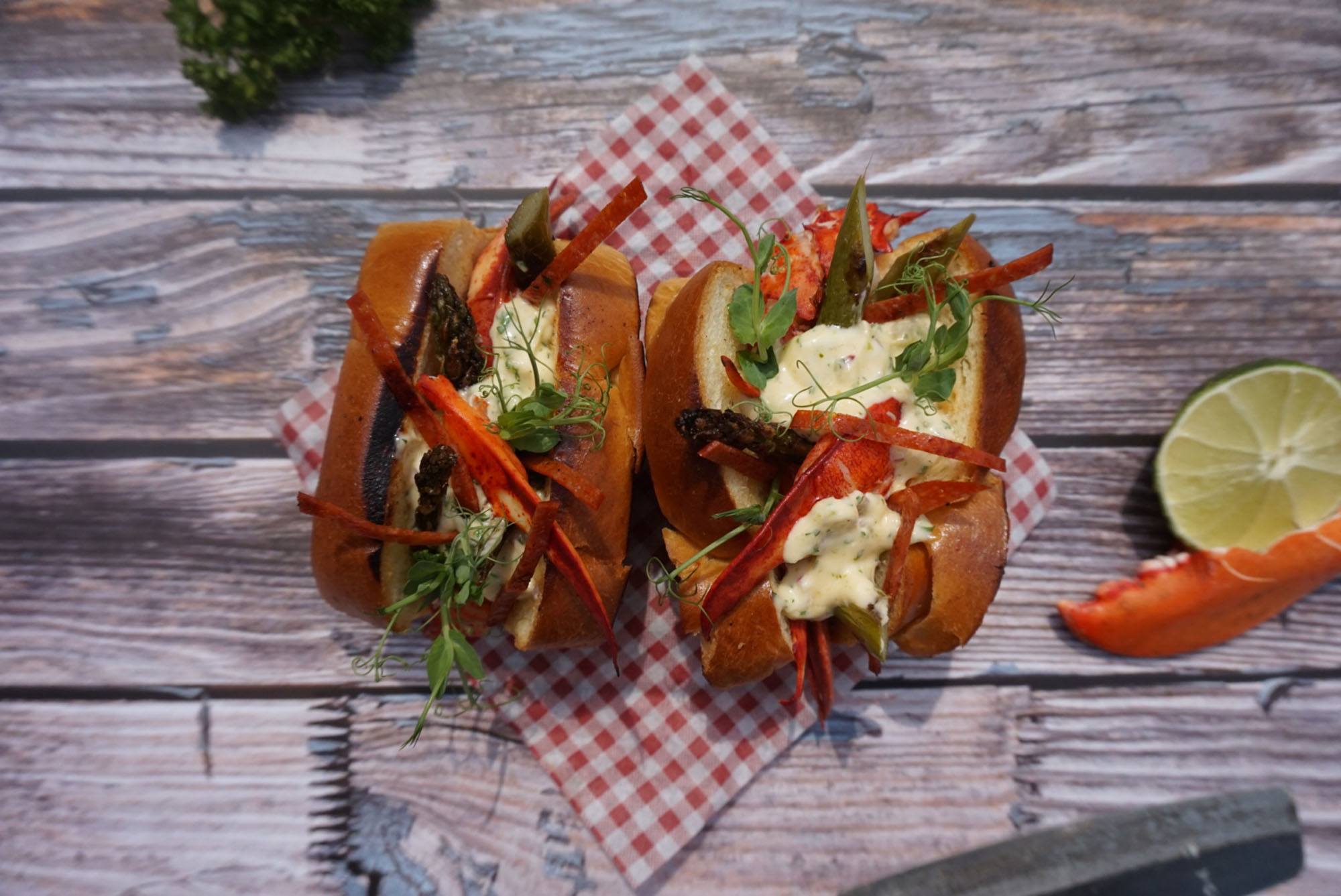 Vul de broodjes met de kreeft, mayo en asperges en chorizo. Garneer af met affilla cress.
