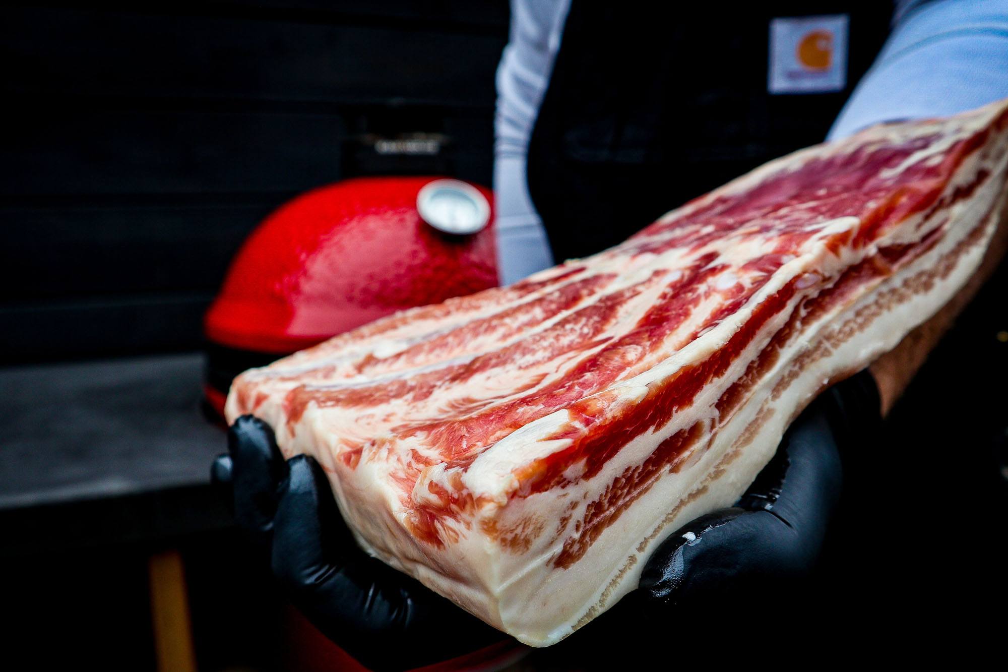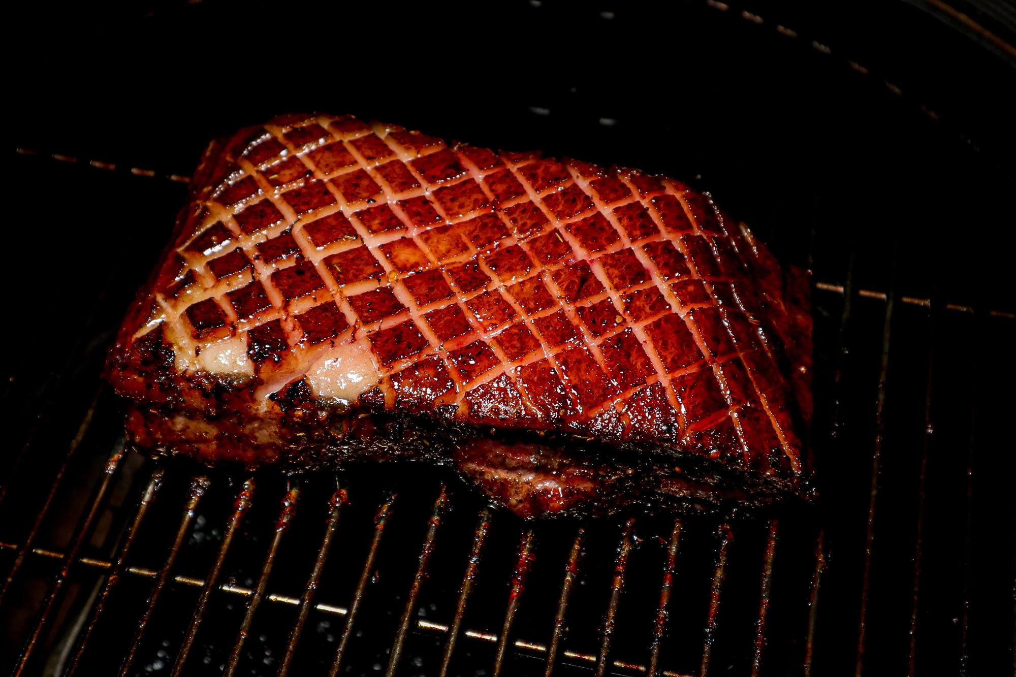 Bereid je bbq voor op indirect, 110 graden. Leg een flinke chunk kersenhout tussen de kolen, en plaats een druippan (minimaal zo groot als het stuk vlees) met 2 cm water onder het vlees. Leg het vlees op de gril met de vetkant naar boven en laat het vlees 1 uur lekker roken. Het bakje met water zorgt ervoor dat de BBQ schoon blijft en het vet wat eraf druipt niet verbrand in de BBQ wat de smaak van het vlees beïnvloed. Het is ook mogelijk om dit recept te maken als zonder zwoerd. Je slaat dan alleen de laatste stap waarbij je de buikspek af gaat grillen over.