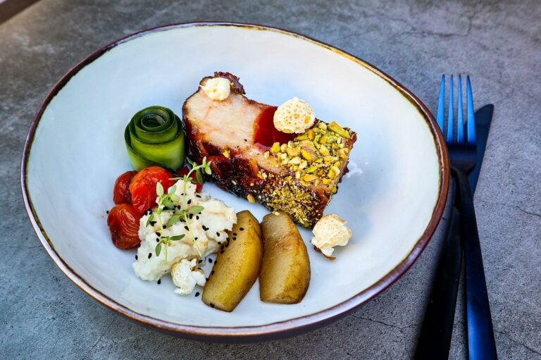 Dip de buikspek in de pistache, en plaats op het bord. Druppel een paar flinke druppels BBQ-saus over de buikspek, en maak de buikspek af met een mespuntje mierikswortel.