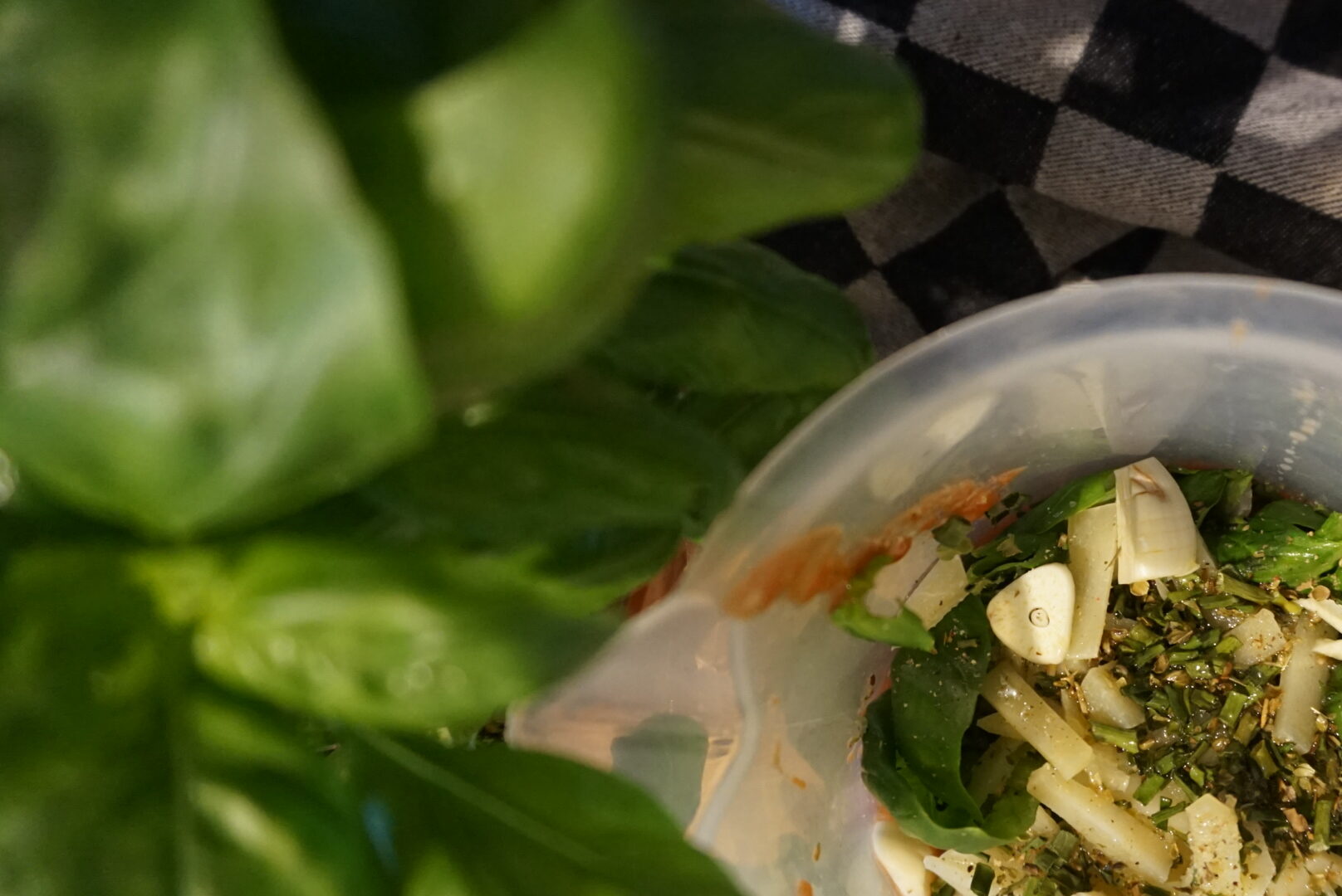 Voor het maken van de saus neem je een grote maatbeker. Voeg hierin het blik tomaten toe, samen met een rode ui in grove stukken gesneden, twee teentjes knoflook, 70 gram Parmezaanse kaas in blokjes gesneden, 15 gram basilicum, 1,5 gram oregano, 2,0 gram peterselie, 1,5 gram gemalen rozemarijn en 1,0 gram bieslook. Pureer dit tot een gladde massa en voeg vervolgens geleidelijk de olijfolie toe terwijl je blijft pureren. Maak het geheel af met peper en zout.