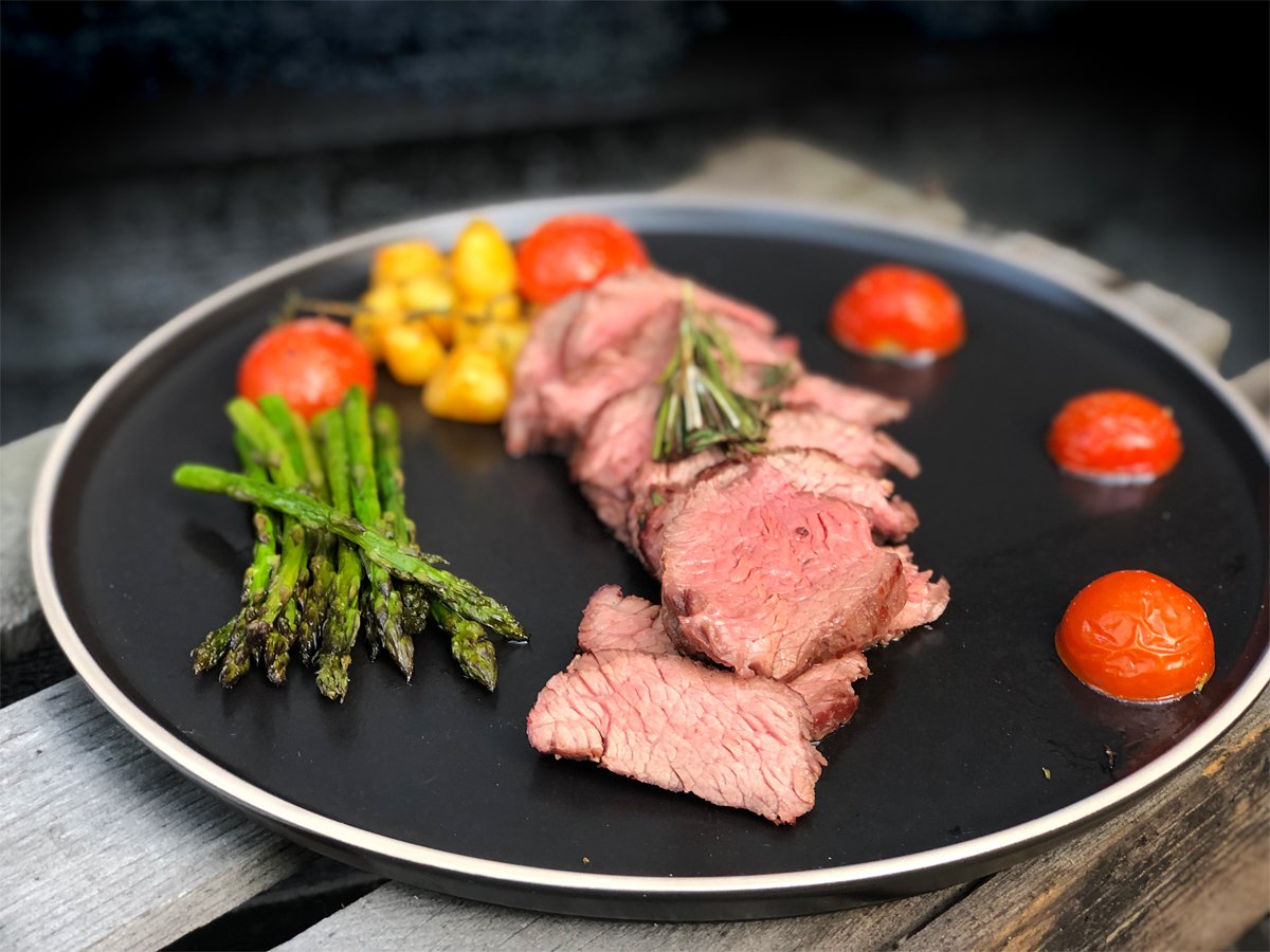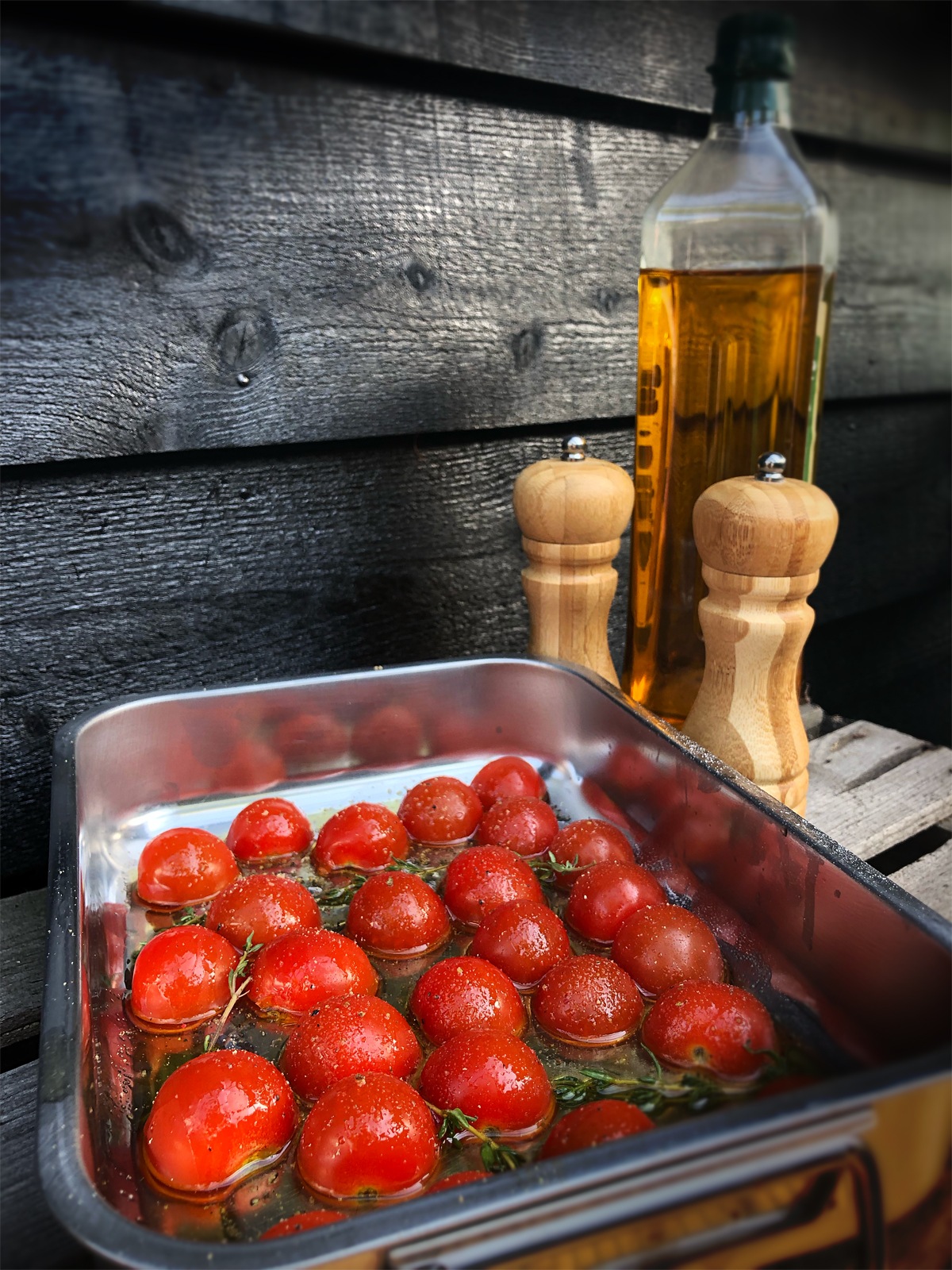 De cherrytomaatjes gaan in een ovenschaal met een dun bodempje olijfolie. We malen wat zout en peper over de tomaatjes. De tomaatjes gaan gelijktijdig met het vlees op de EGG tot de tomaatjes zacht worden en al enigszins open scheuren.