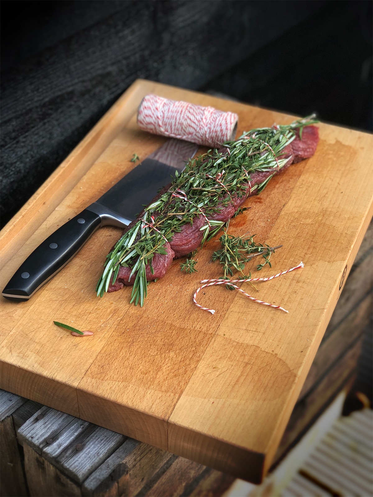 Voor de voorbereidingen aan de diamanthaas pakken we enkele lange takjes rozemarijn en tijm. Deze gaan we met slagerstouw rondom de diamanthaas vast binden. Leg hiervoor enkele touwtjes op een rijtje met een tussenruimte van zo’n 2 centimeter. Leg hier haaks op enkele takjes rozemarijn en tijm. Dan gaat de diamanthaas er op. Tegen de zijkanten en bovenop het vlees gaan ook takjes kruiden waarna we de touwtjes kunnen vast knopen. Tijdens het poffen van de knoflook en de voorbereiding van het vlees, is de diamanthaas al op kamertemperatuur kunnen komen.