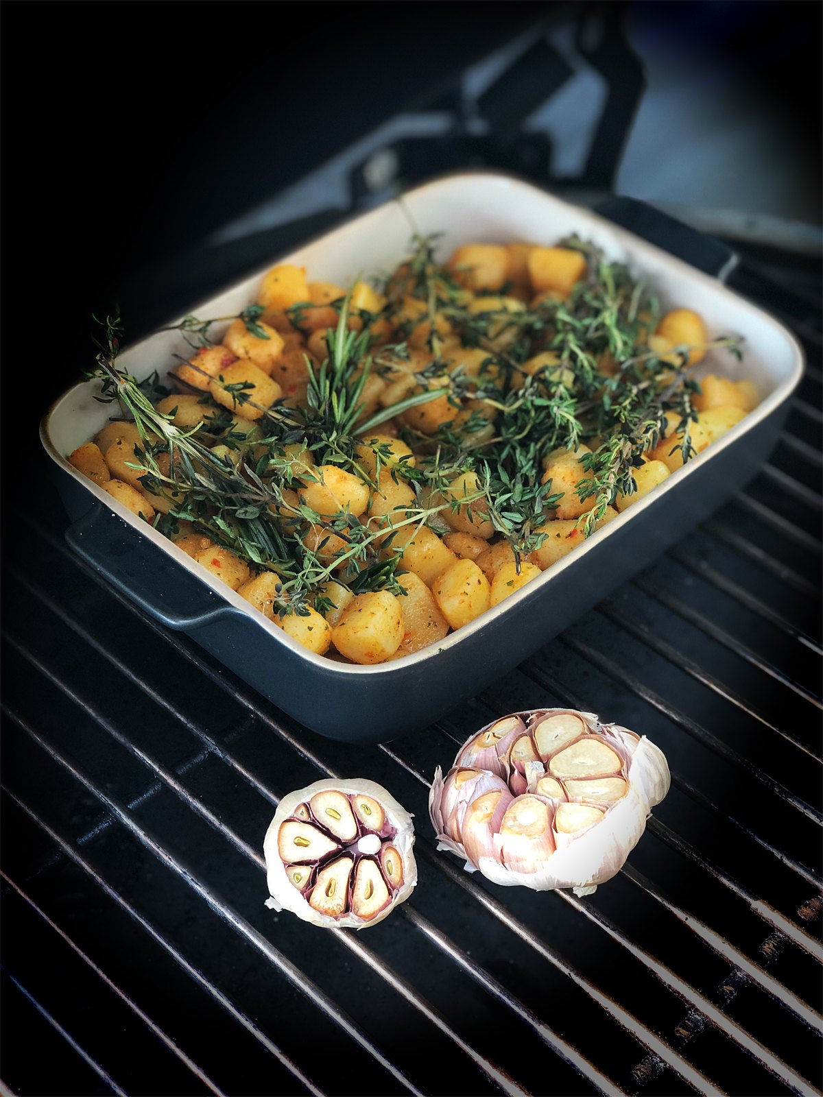 De voorgekookte krieltjes gaan in een ovenschaal met een scheut olijfolie en enkele korte takjes rozemarijn en tijm. De krieltjes hebben wat langer nodig dus mogen ze meteen op de EGG naast de knoflook. Schep ze tussendoor om in de ovenschaal. Mochten de krieltjes eerder gaar zijn, dan kun je ze met aluminiumfolie afgedekt warm houden.