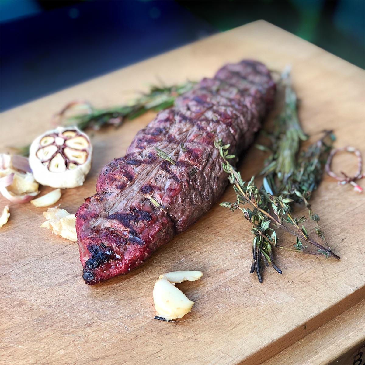 We halen de tenen uit de knoflook en smeren het vlees rondom in met de zachte knoflook. Daarna leggen we de diamanthaas met temperatuurmeter terug op het gietijzeren rooster. Bij een kerntemperatuur van 46-48 graden keren we het vlees om.