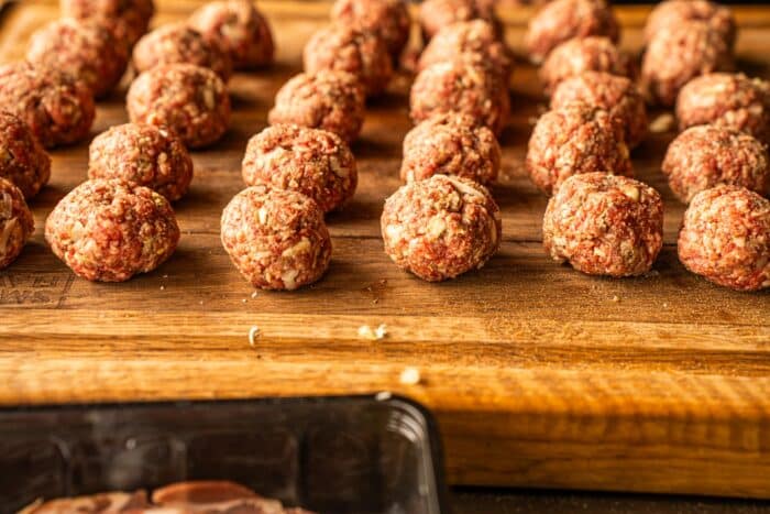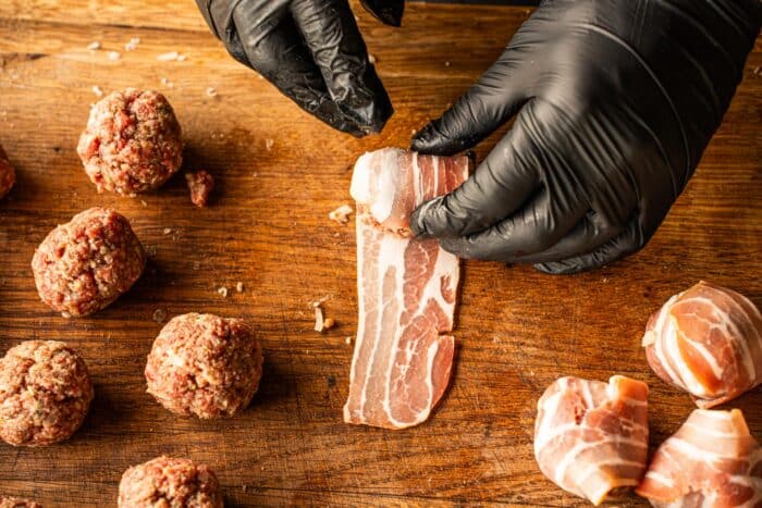 Om de balletjes te vormen, maak je balletjes van ongeveer 3cm. Wanneer je de balletjes allemaal even groot wilt maken, kan je dat het beste doen met een ijsschep. De balletjes weeg je af op 40 gram en daarna druk je ze een beetje plat. Draai de balletjes rond en leg ze daarna een half uurtje in de koelkast, hierdoor worden ze steviger om in te rollen. Hierna leg je een stuk ontbijtspek op je werkblad, daarna pak je een balletje en die leg je op het achterste stuk van het ontbijtspek. Rol hem in en zorg ervoor dat het gehakt volledig bedekt is met het ontbijtspek. Doe dit vervolgens bij alle balletjes. Na het inrollen doe je een klein beetje olijfolie over de Moinkballs en breng je ze op smaak met Honey Chili rub.