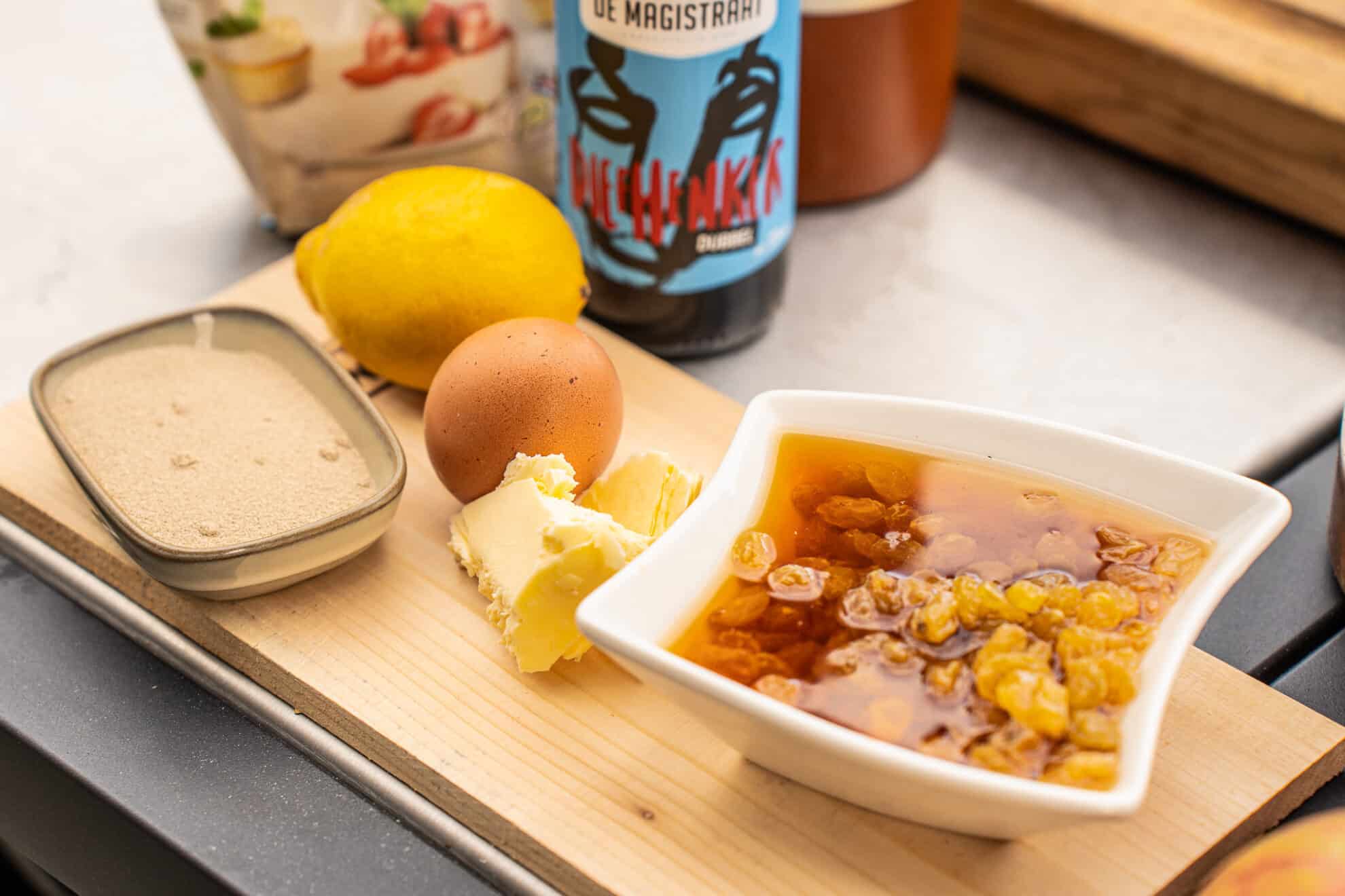 Lauwwarm water, 160 ml, Diefhenker, 1 dl, Droge gist, 24 gram, Witte basterdsuiker, 15 gram, Ei, 30 gram, Citroenrasp, 1 citroen, Roomboter, 30 gram, Bloem, 300 gram, Rozijnen in schrobbelèr, naar smaak, Appel, 2 stuks.