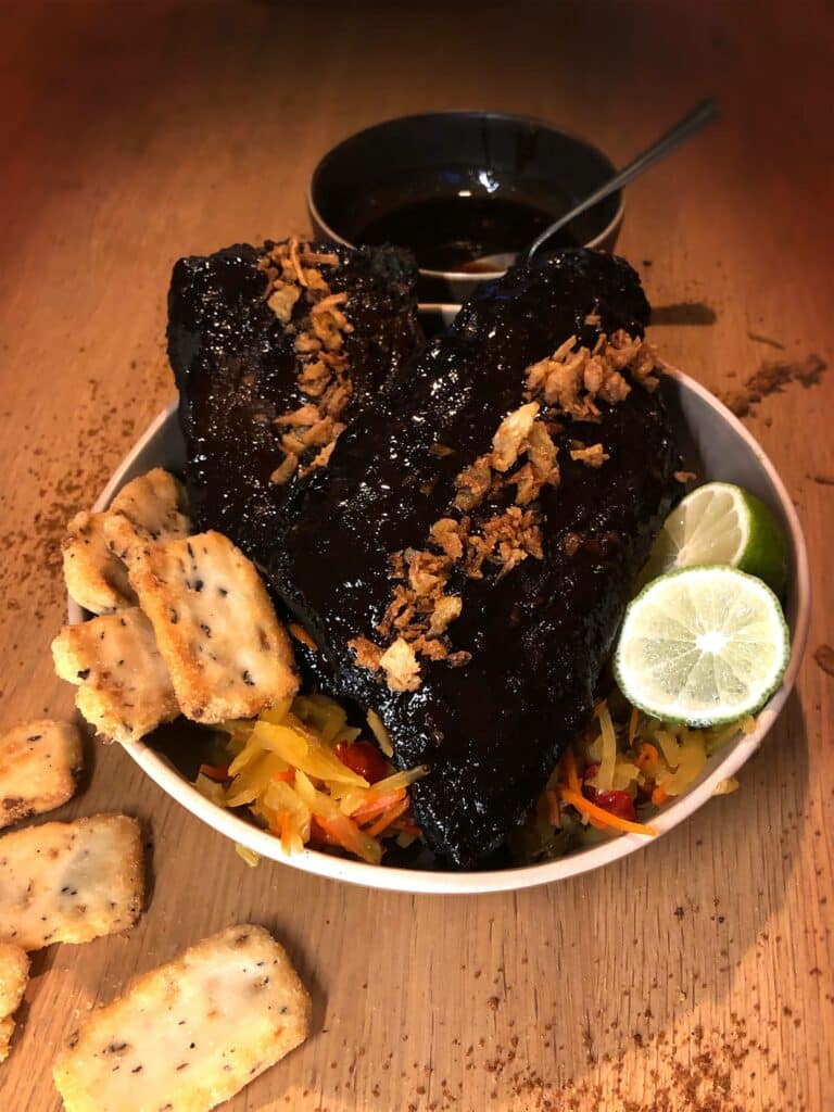 Serveer de spareribs in een schaaltje met wat rijst, atjar tjampoer, krokante ui en de saus. De saus mag men zelf met een lepeltje aanbrengen of gewoon lekker rechtstreeks dippen. In dit geval mag je de spareribs met de handen eten in plaats van met stokjes!