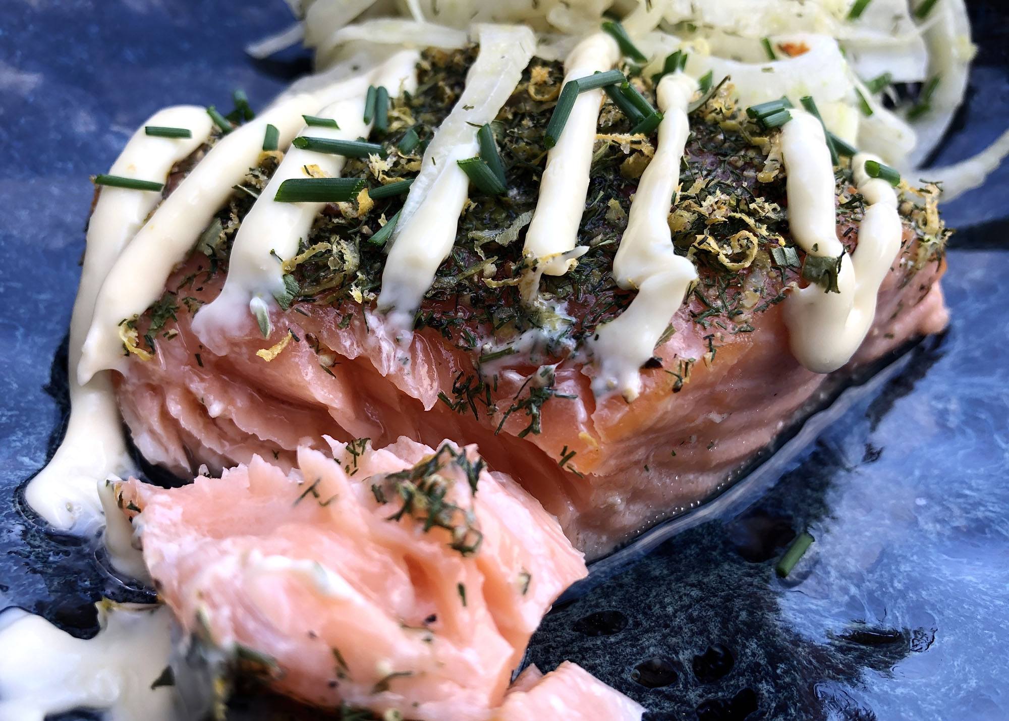 Neem de plankjes uit de barbecue en leg de gerookte zalm op een bord, spuit wat banen wasabi mayonaise erover en serveer met de zoetzure venkelsalade.