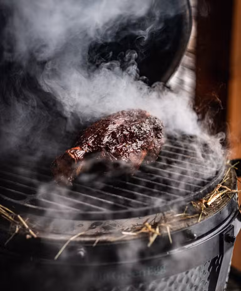 Beenham in de kamado roken op hooi