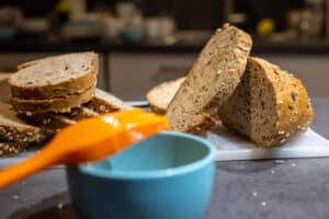 Terwijl je wacht tot je BBQ warm is, is het tijd om het brood, de salami, de rode ui en de knoflook klaar te maken. Snij de knoflook fijn en meng hem samen met een flinke scheut olijfolie in een kleine schaal.