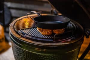 Tijd om te genieten van een heerlijke lunch op je kamado! Maak hem gereed door hem op te warmen tot een temperatuur tussen de 150-170 graden Celsius met directe hitte. Zet de gietijzeren plancha bovenin het multilevel systeem met de skillet er bovenop, zodat het op temperatuur kan komen.