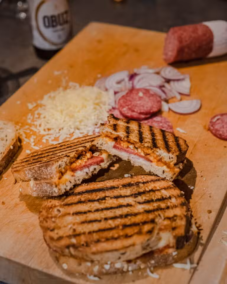 Neem twee boterhammen en kwast de bovenkant in met wat van de knoflookolie. Draai hierna de boterhammen om en voorzie beide van een goede laag van de pizzasaus. Strooi hier wat Italiaanse kruiden over en peper en zout naar smaak. De jong belegen kaas gaat op één van de boterhammen gevolgd door een beetje rode ui. Breng de mozzarella rijkelijk aan en beleg deze met de plakjes salami en blaadjes van het basilicum. Voeg nog een dunne laag jong belegen kaas toe en leg de andere boterham er bovenop. De pizza tosti is nu gereed om gegrild te worden, maar je kunt natuurlijk altijd eerst een voorraadje maken.