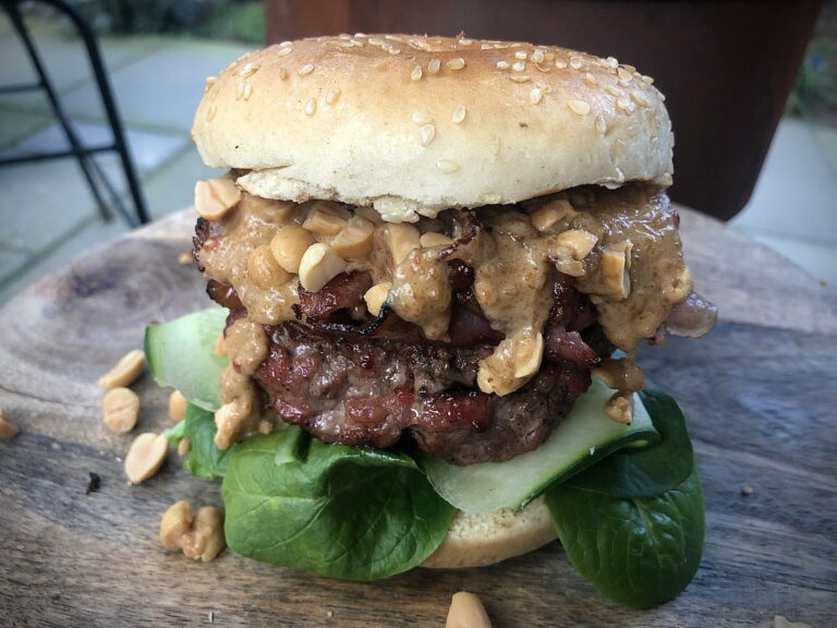 Pak een grote plank of schaal erbij en leg hier de bodems van de broodjes op. Bedekt deze met wat kropsla, en plakken komkommer. Leg hier de hamburgers op en beleg deze royaal met krokant spek. Giet er je eigen gemaakte pindasaus over en strooi de gehakte pinda’s op de saus voordat je de burger bekroond met de bovenkant van het broodje.