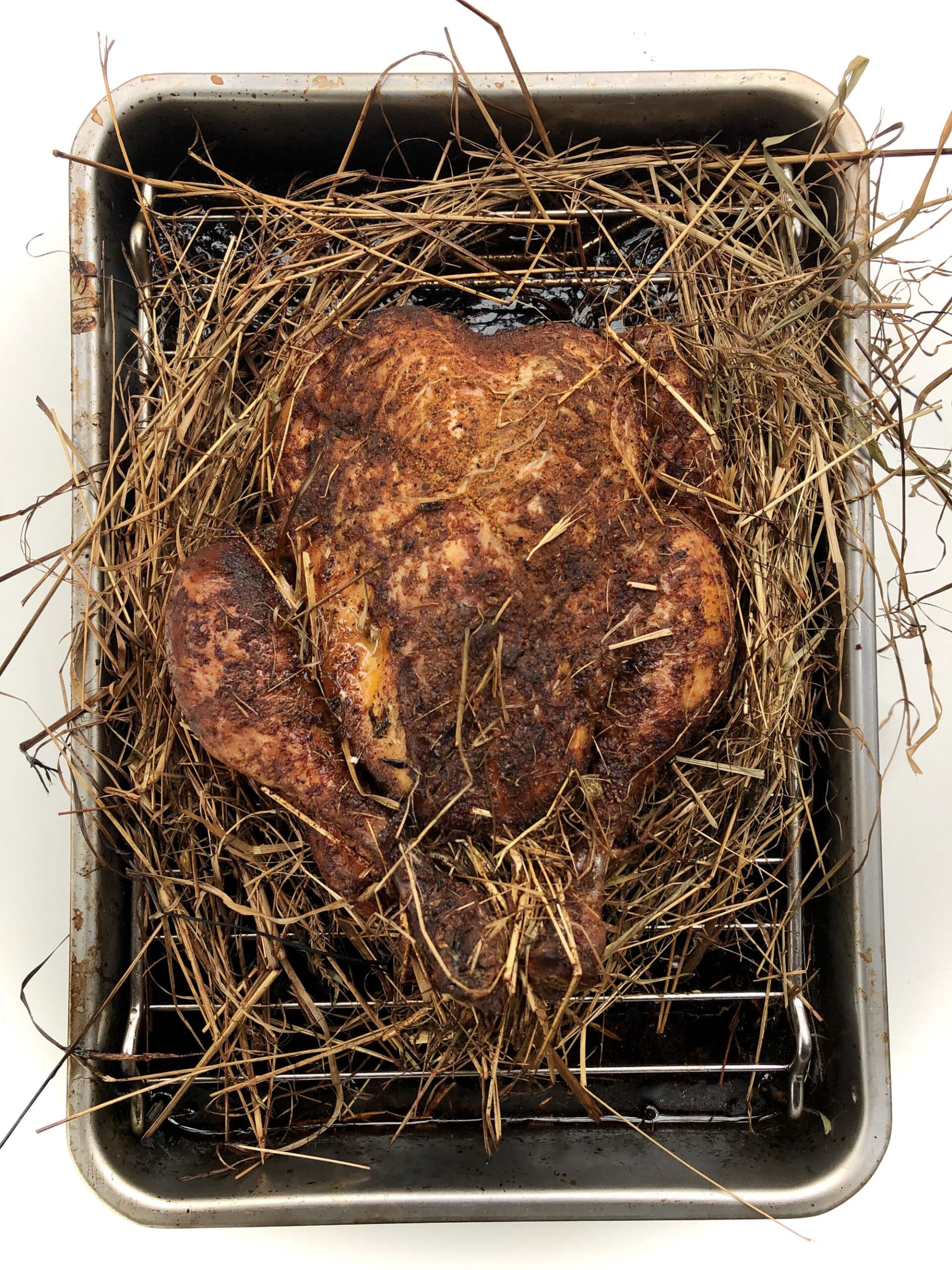 Maak van het geweekte hooi een mooi bosje en stop dit in de kip. Met een spuit injecteren we de dunne boter op enkele plaatsen in de borst en poten. Met de boter kun je ook de gehele buitenkant van de kip mee inwrijven, zodat de hierna aan te brengen rub beter hecht op de huid.