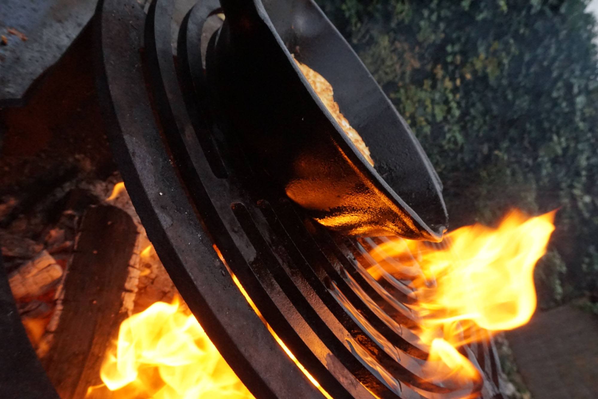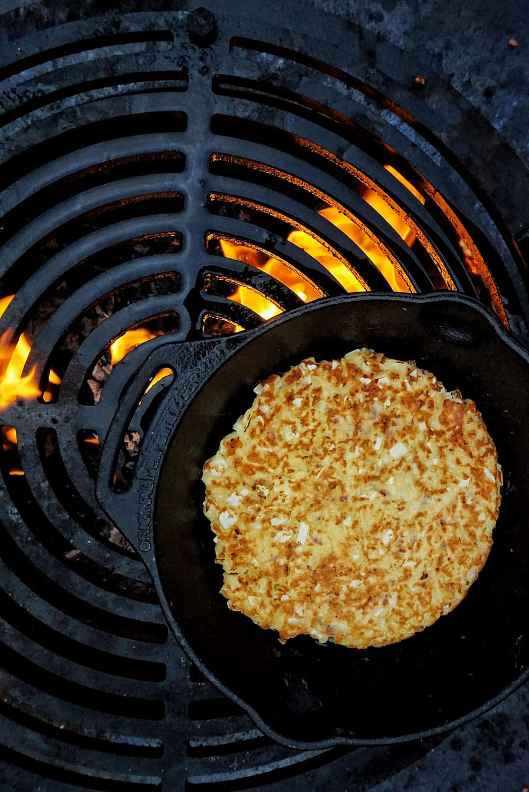 Ik heb bij dit gerecht gekozen om een gietijzeren skillet te gebruiken. Ik heb de skillet boven een vuurring bbq geplaatst zodat de vuurring de pannenkoeken die klaar waren warm kon houden. Door gebruik van de skillet kun je iedere type bbq gebruiken voor dit gerecht. Eventueel ook op een plancha mogelijk.