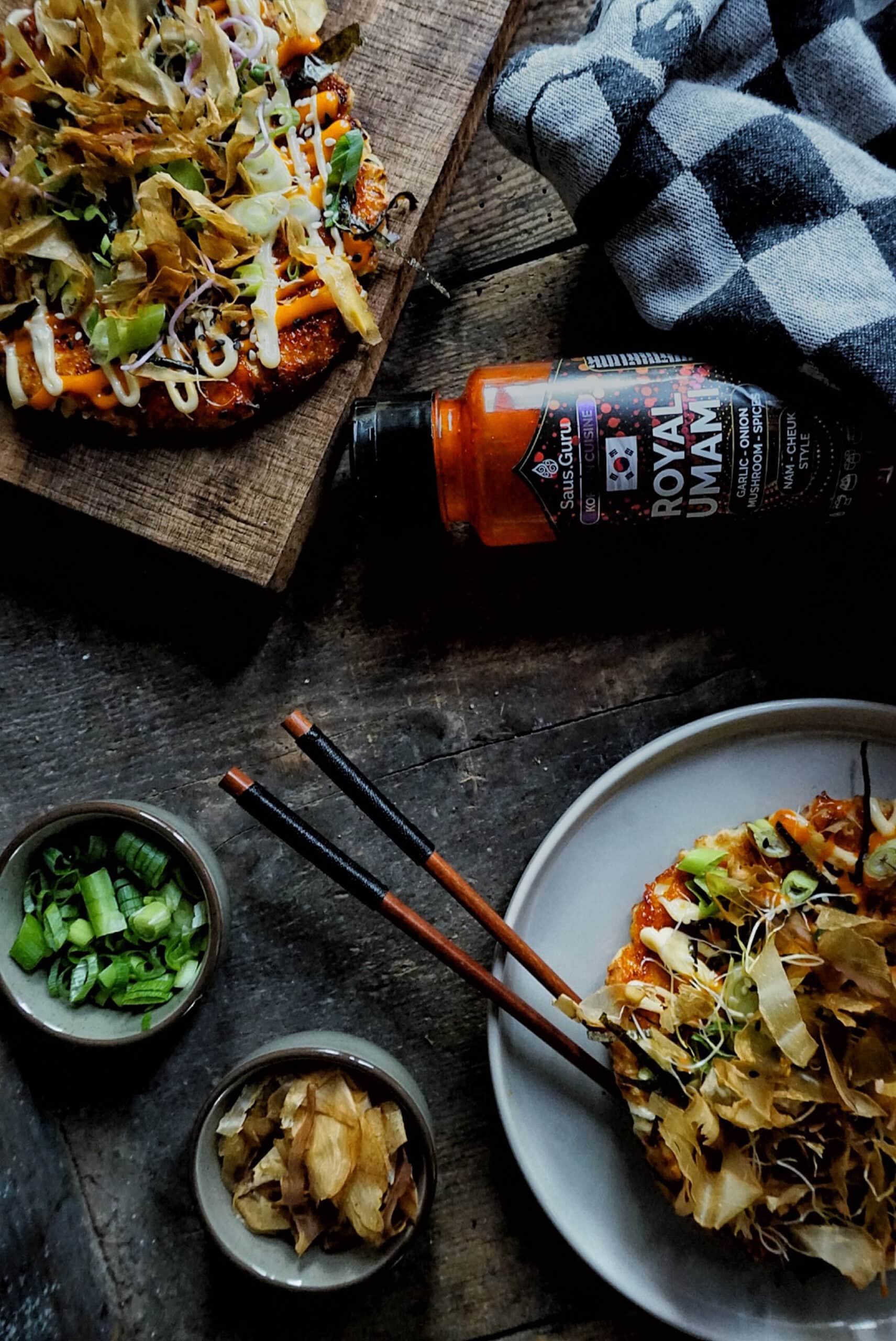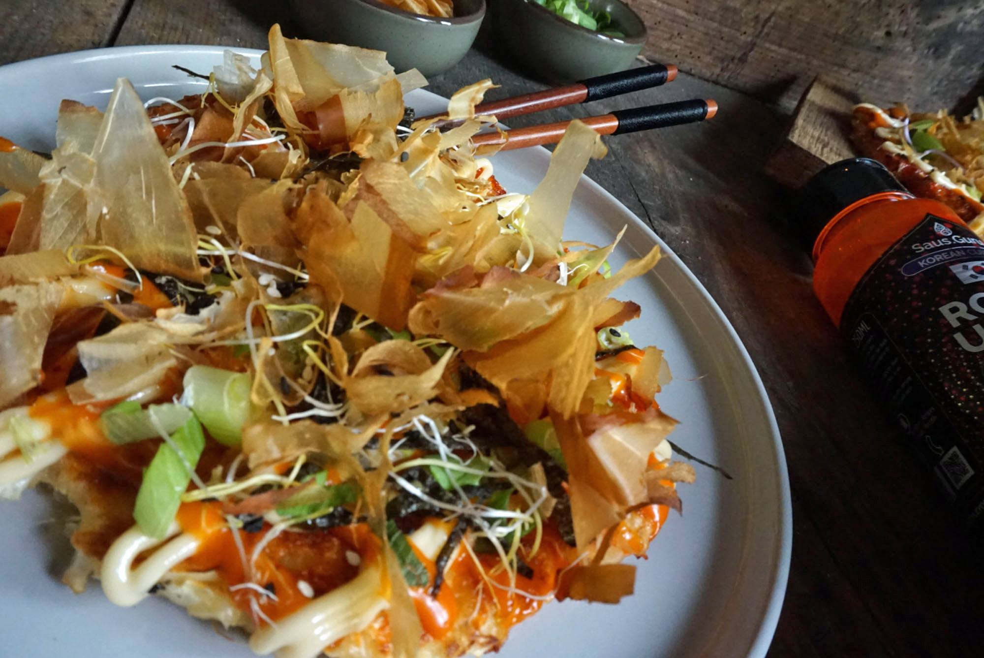 Hoe dan ook is dit een ware Umami bom, net zoals wij in nederland pannenkoeken met verschillende toppings nuttigen kan dit ook met deze okonomiyaki’s. Veel voorkomende toppings is kewpie-mayo, Bonito Vlokken (gedroogde tonijn), nori, bos ui, okonomiyaki saus, varkensbuik, garnalen en octopus. Dit gerecht bevat vis, schaal en schelpdieren. Deze ingrediënten kunnen eventueel weggelaten worden.