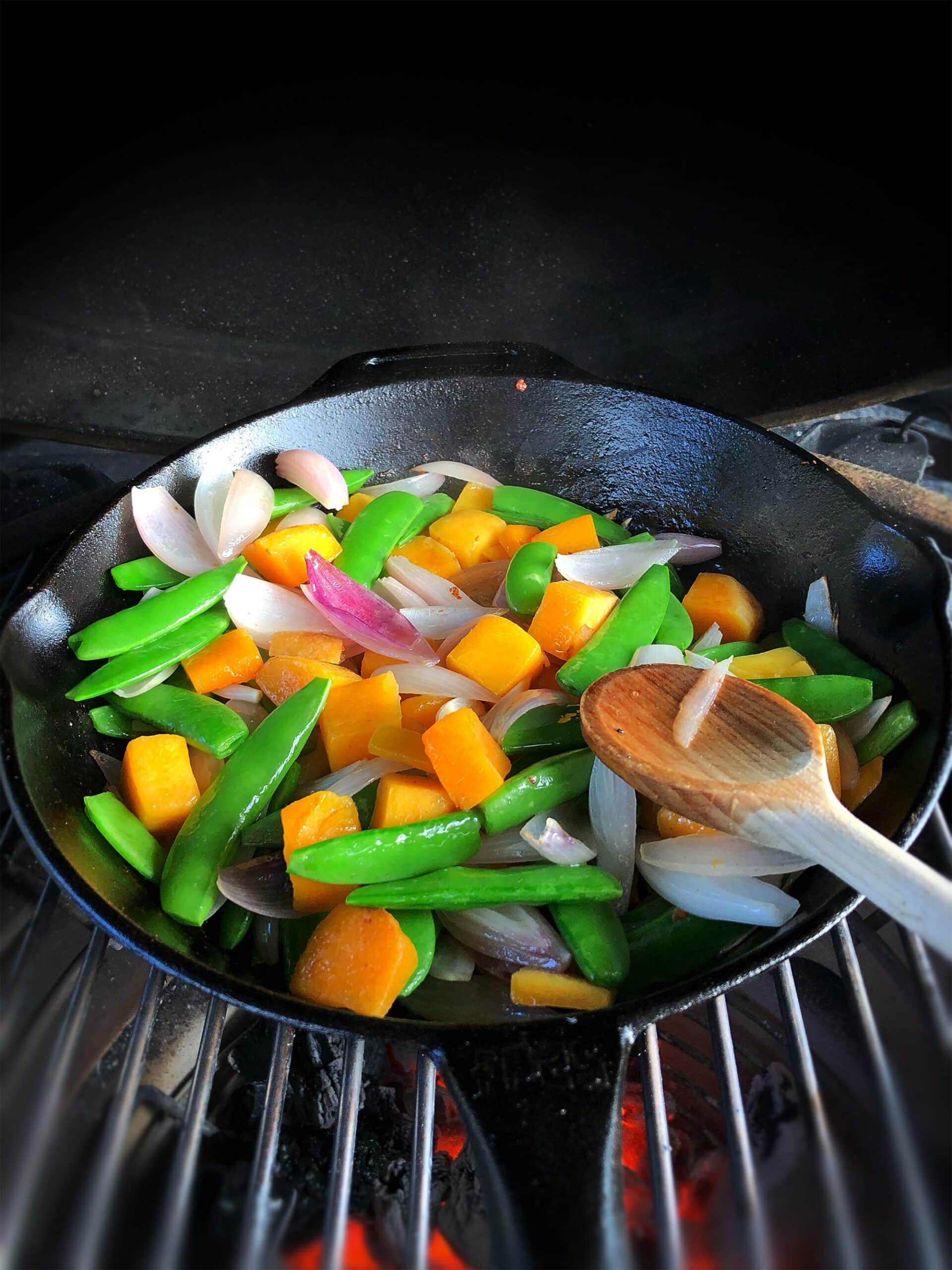 In de skillet maak ik eerst de groente klaar. Zet de skillet op het rooster en sluit de kamado. Terwijl de skillet opwarmt zorgen we dat alle ingrediënten klaar staan: maak de sjalotten schoon en halveer ze. Snij de paprika in blokjes en de kastanjechampignons in kwarten. De toppen van de Sugar snaps snijden we er ook af. Voor de pompoen heb ik gekozen voor voorgesneden blokjes, zodat ik niet onnodig veel over hou.