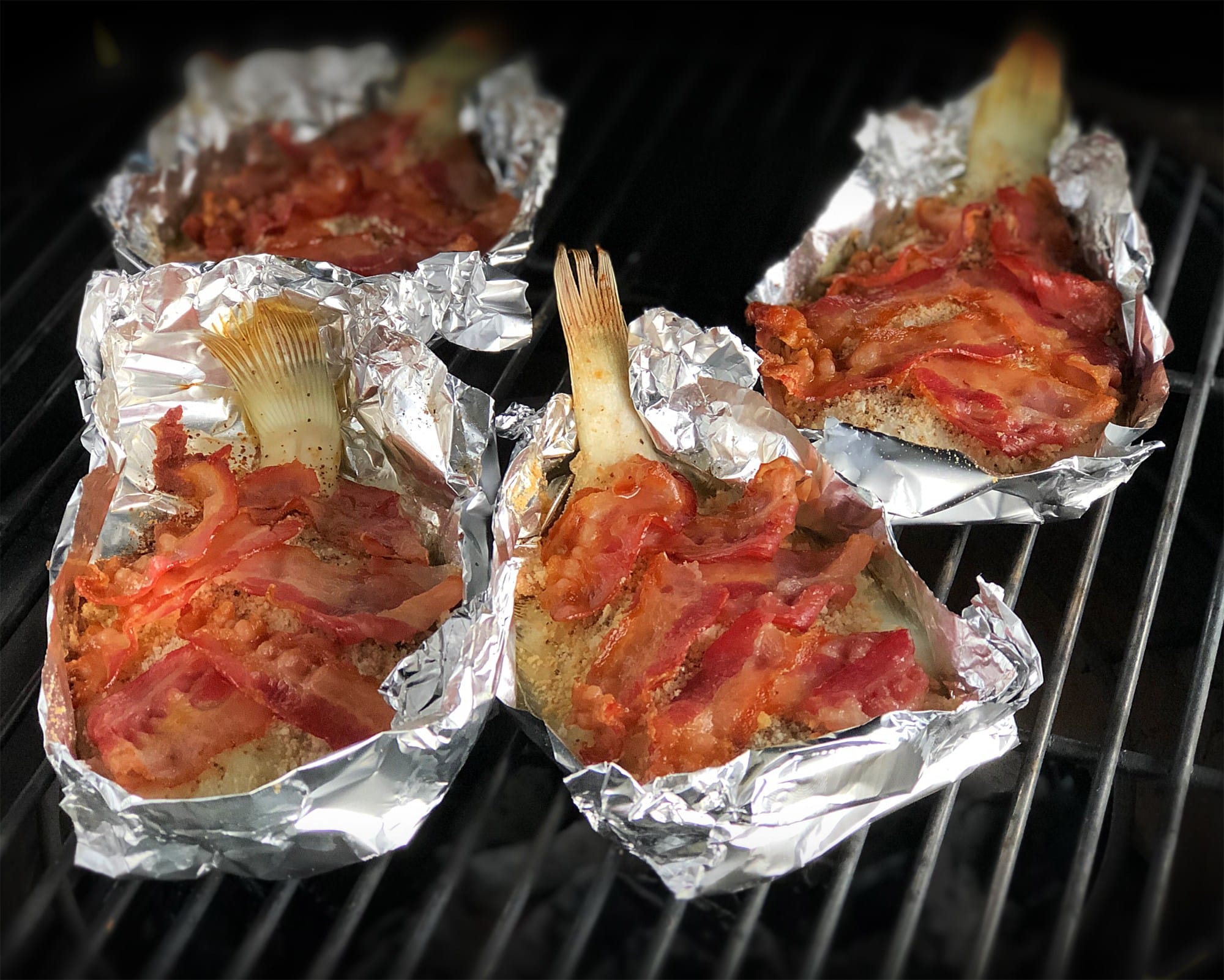 De vis voorzien we van lemonpepper en de zelf gemaakte paneermeel. Daar bovenop gaat de bacon. Aangezien de vis maar relatief kort op de barbecue gaat, koos ik voor het gemak voor streaky bacon. Zodoende zal de bacon toch lekker crispy zijn als de vis klaar is. De plakken of snippers bacon eerst in de skillet bruin bakken en daarna op de schollen leggen kan natuurlijk ook.