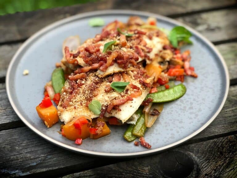Voor dit recept heb je 4 schollen, 12 plakken Streaky bacon, 2 bruine boterhammen, Olijfolie, Lemon pepper, 150 gram Sugar snaps, 8 Sjalotten, 400 gram Pompoen blokjes, 1 Rode paprika, 150 gram Kastanjechampignons, Saus.guru Royal Umami en Verse oregano nodig.