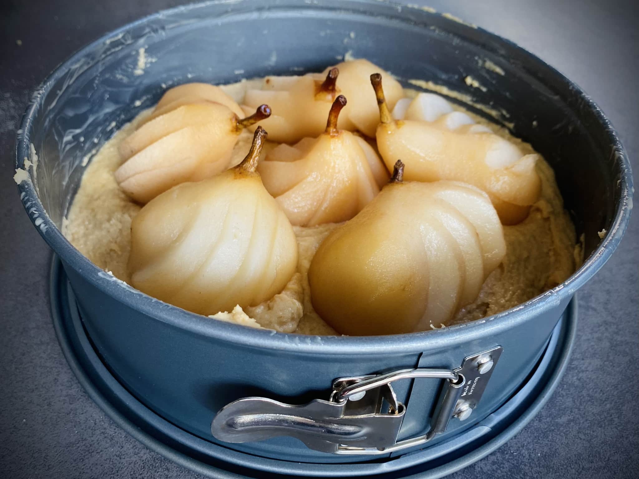 Vet de springvorm in met wat boter en spatel hierna het beslag in de vorm. Snij de inmiddels afgekoelde stoofperen vanaf het kroontje tot een stukje voor het steeltje om de halve centimeter in. Leg vijf stoofperen rond in het beslag met het steeltje omhoog en druk ze voorzichtig tot aan de bodem. Doordat de peren zijn ingesneden kun je ze mooi decoratief als een waaier open leggen. Doe dit ook met de laatste peer die je in het midden legt.