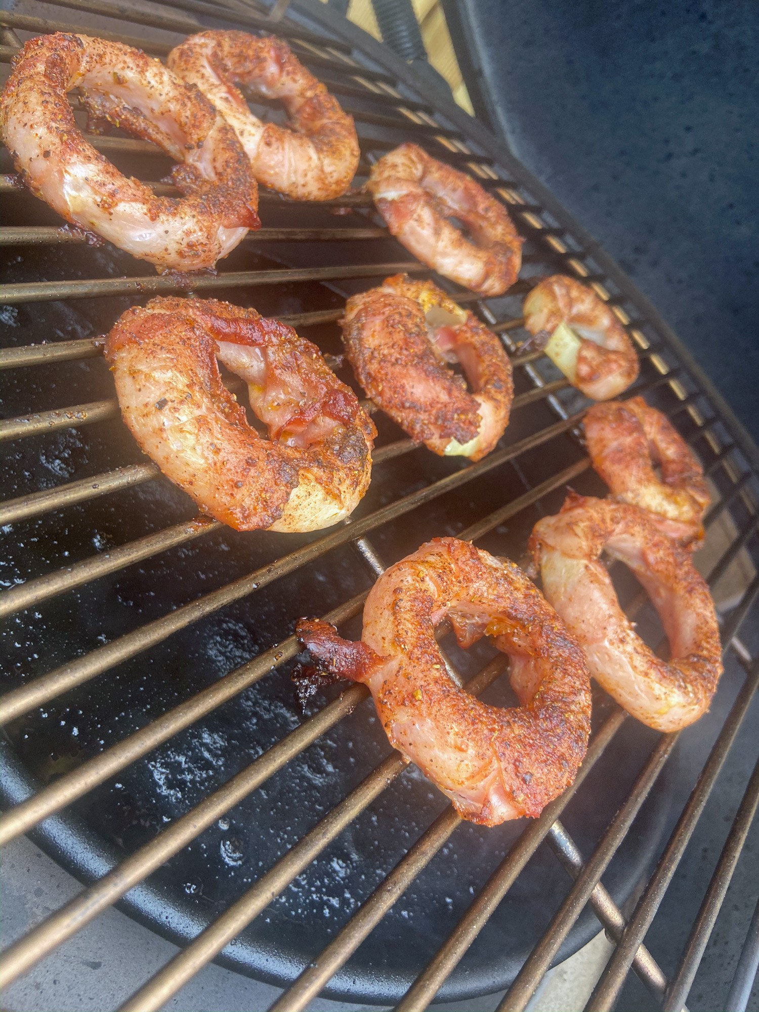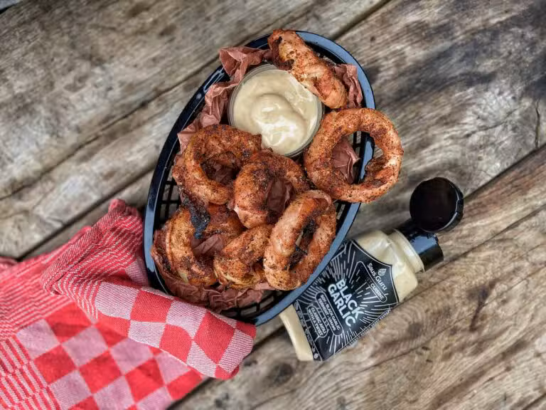 Stook de bbq op tot 180 graden indirect en gaar de ringen mooi crispy, serveer met black garlic sauce.