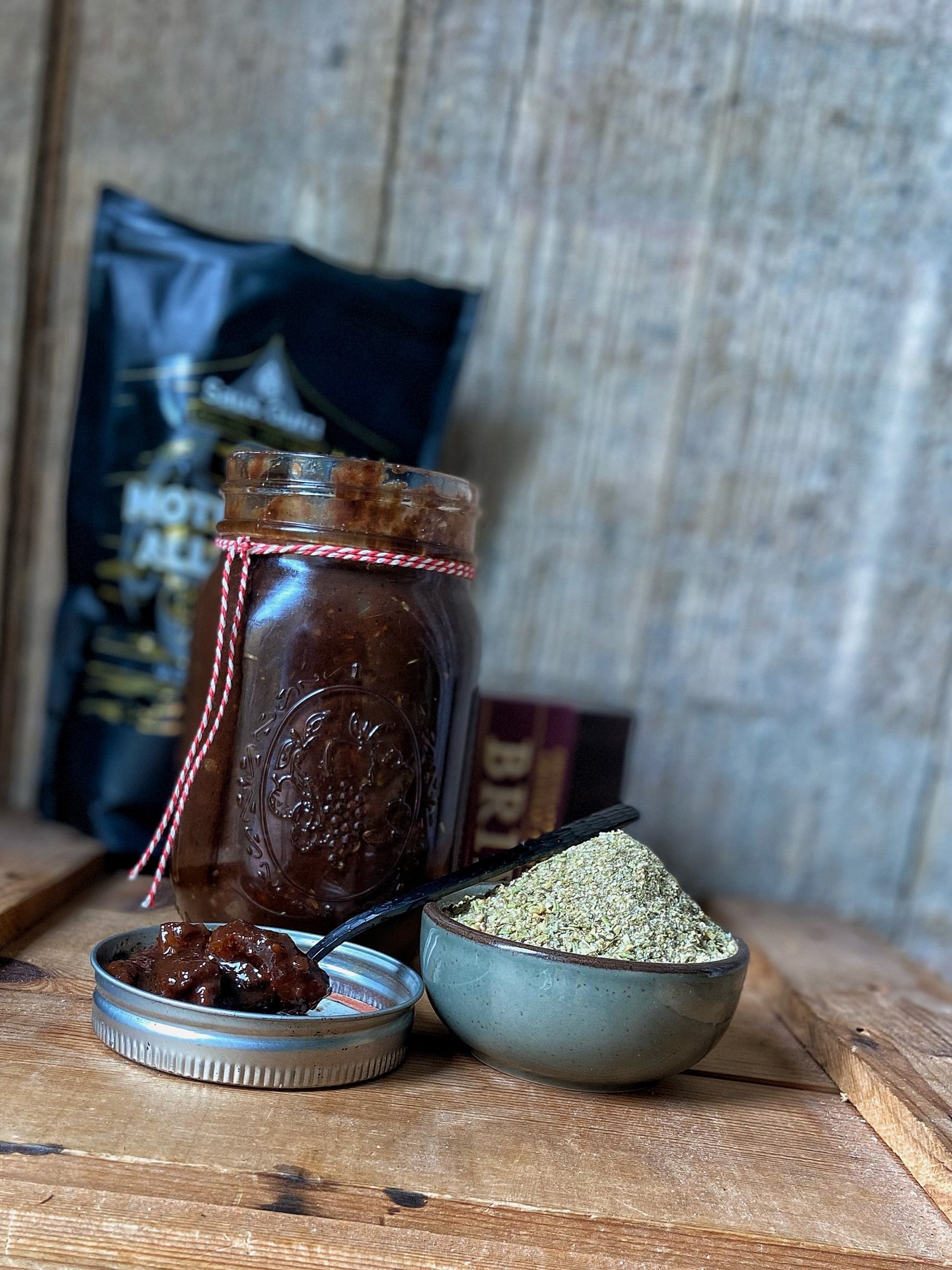 Stook de bbq op tot 170 graden. Zet de dutch oven erin en laat deze warm worden. Wanneer deze warm is fruit de knoflook, ui en bacon aan in de pan. Bak de bacon niet crispy maar alleen zacht, zo krijg je een zachtere structuur in de jam. Voeg nu de rub, basterdsuiker en water eraan toe.