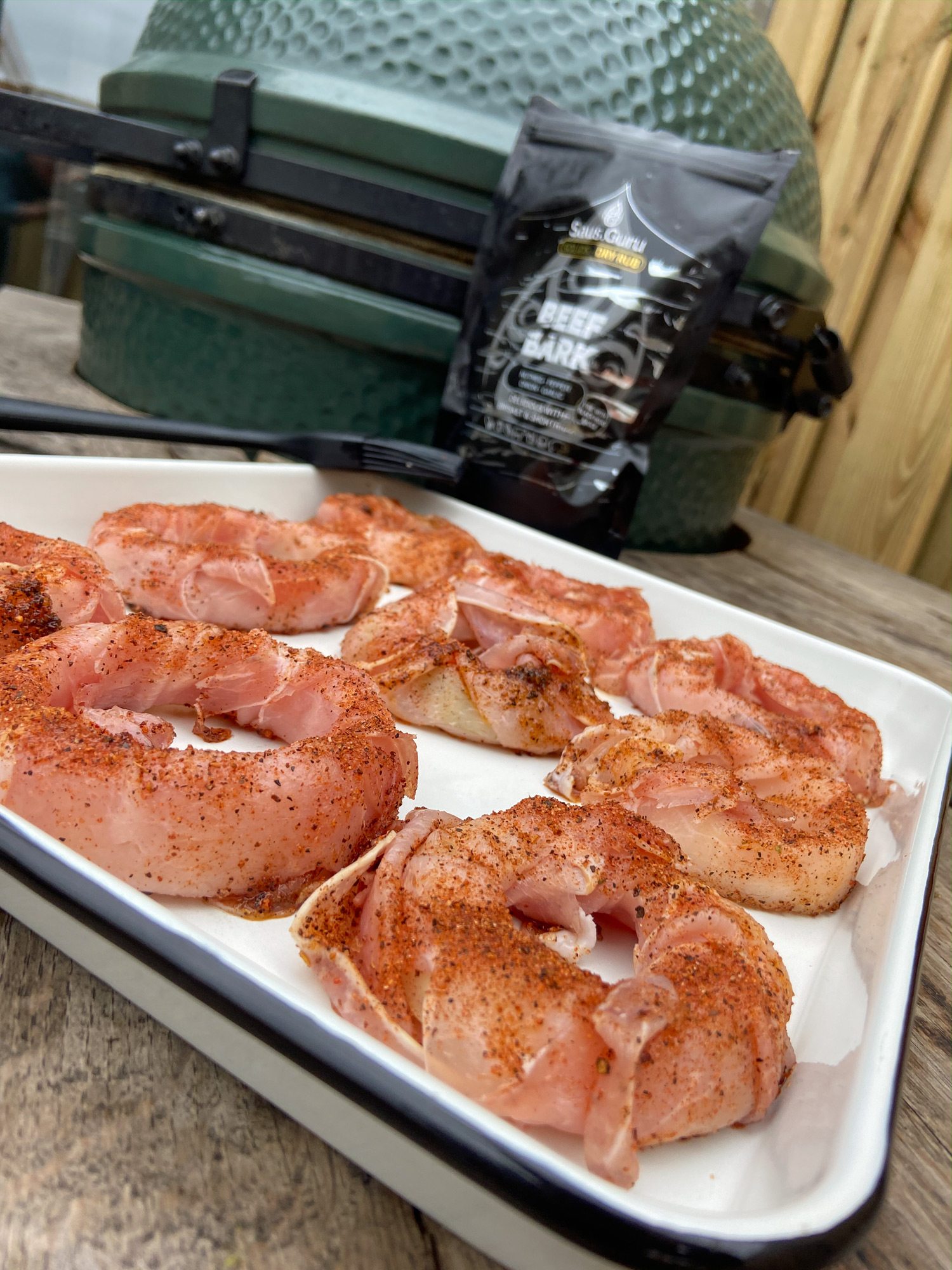 Probeer 2 tot 3 uien ringen die in elkaar passen bij elkaar te houden voor een mooi stevig resultaat. Neem nu de bacon plakken en gebruik er ongeveer 2 per ring, draai nu de plakken om de randen heen. Smeer de olijfolie met een kwastje op de bacon. Strooi nu de beef bark eroverheen. Draai de onion rings om en herhaal dit.
