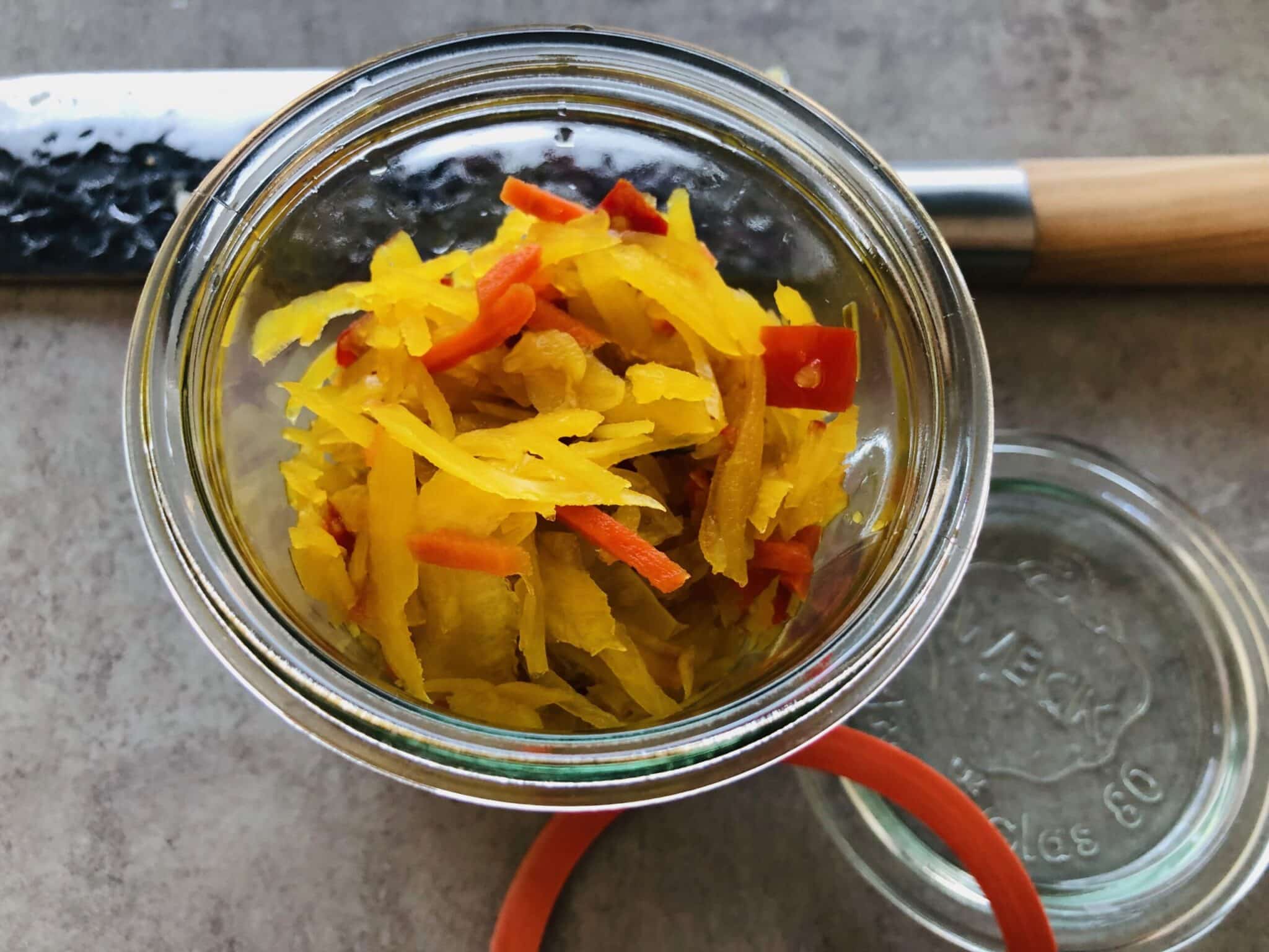 Voor de atjar meng je de overgebleven gember, knoflook, kurkuma en suiker door de wittewijnazijn en breng dit aan de kook. Dit laat je vervolgens 1 minuut doorkoken en daarna afkoelen. Daarna breng je water aan de kook en kook je de witte kool, wortel en paprika voor zo’n 2 minuten. Doe de groente in een weckpot en giet het over de groente, roer iets door en sluit de weckpot goed af. Laat afkoelen.