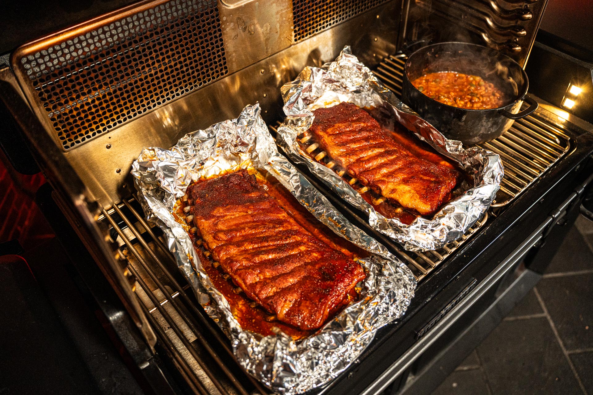 We garen ze dan ongeveer 45 minuten. Vervolgens vouwen we de pakketjes open, draaien we de ribben met de vleeskant naar boven en garen we ze nog ongeveer 20 minuten verder. Tussendoor bestrijken we de ribben elke 5 minuten goed met de ontstane saus in het pakketje.