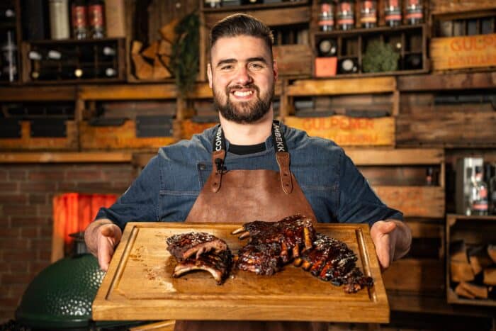 Je steek de barbecue aan en brengt deze naar een temperatuur van 200 graden. Vervolgens plaats je het half directe/half indirecte systeem. Daarna giet je de azijn in de skillet en voeg je de suiker toe. Hierna snijd je de gember in plakjes, plet de knoflook, kneus de jeneverbessen en voeg deze samen met het stukje Spaanse peper aan de azijn toe. Verwarm dit mengsel tot de suiker is opgelost. Haal de skillet van het vuur zodra de suiker is opgelost. Let wel op de skillet word erg warm in de kamado dus gebruik handschoenen als je de skillet uit de kamado haalt.