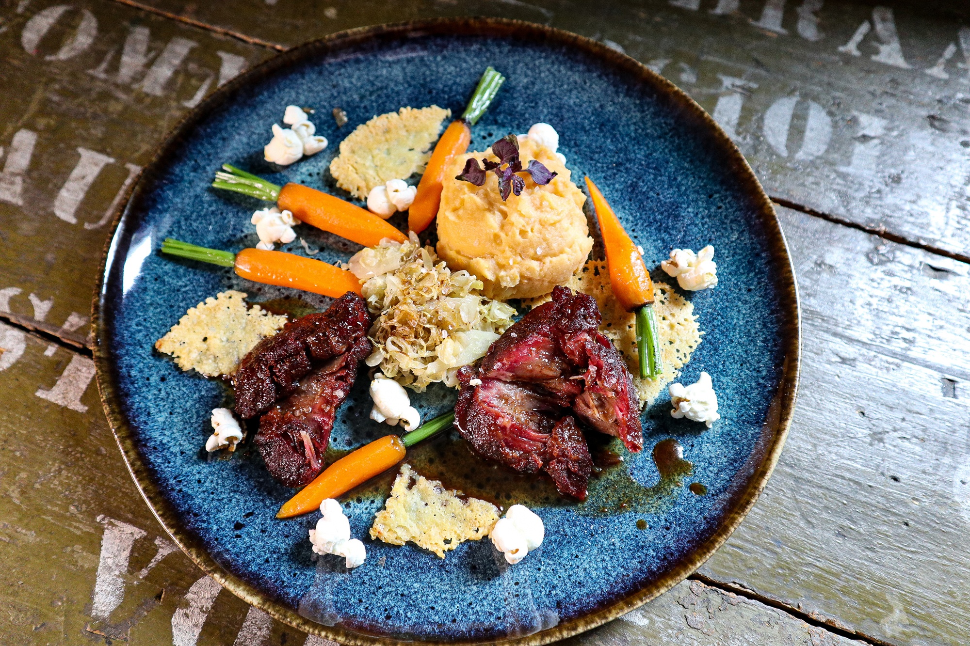 Zuurkoolstamp met zoete aardappel, gerookte en gestoofde varkenswangen met een dikke bier jus, geglaceerde whisky honing worteltjes, afgemaakt met stukjes kaas kletskop. Een hele mond vol, dus laten we snel beginnen!