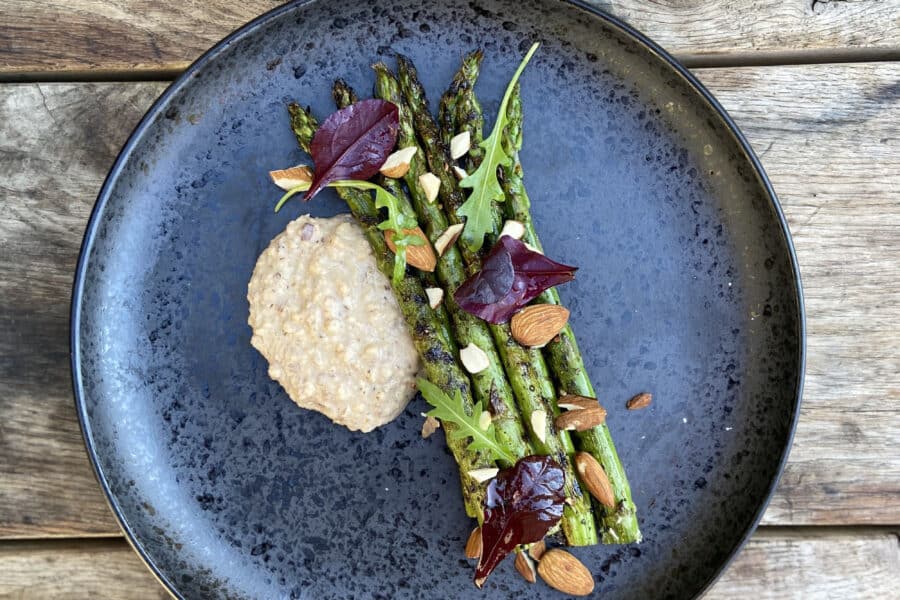 • eindproduct groene asperges met burrata van de kamado barbecue recept bijgerecht